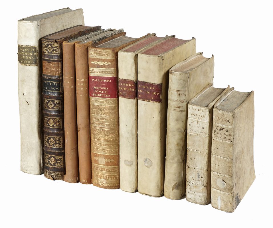 Compongono il lotto: 1) Pineda Juan (de), Commentariorum in Job libri tredecim [...]. Tomus primus (-secundus). Venetiis: apud Homobonum Bettaninum, 1739; 2) Viva Domenico, Cursus theologicus ad usum Tyronum elucubratus, et in quotidianis praelectionibus [...] Pars prima (-octava). Patavii: ex Typographia Seminarii apud Joannem Manfrè, 1755; 3) Zaccaria Francesco Antonio, Anecdotorum Medii Aevi maximam partem ex archivis Pistoriensibus… Augustae Taurinorum : ex typographia regia, 1755; 4) Raimundo de Penafort (santo), Summa ad manuscriptorum fidem recognita & emendata... Veronae: ex Typographia Seminarii, 1744; 5) Pallavicino Sforza, Vera oecumenici concilii Tridentini [...] Pars prima (-tertia). Augustae Vindelicorum: s.e., 1775; 6) Cavalieri Giovanni Michele, Opera omnia liturgica [...]. Tomus primus [-quintus]. Bassani, sed prostant Venetiis: apud Remondini, 1778 (2 copie. Una con 5 tomi in 1 volume; l'altra con 5 tomi in 2 volumi).