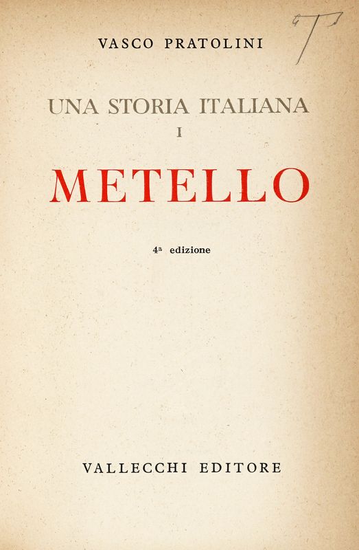 Compongono il lotto: 1) Edilio Rusconi, Comune Solitudine. Roma: Rizzoli, 1944. 2) Ugo Ojetti, Scrittori Che Si Confessano, Milano: Fratelli Treves, 1926. 3) Id., Più Vivi Dei Vivi. Milano: Mondadori, 1938. 4) Vasco Pratolini, Metello. Firenze: Vallecchi, 1955. 5) Mario Luzi, Dal Fondo Delle Campagne, Torino: Einaudi, 1965. 6) Elio Vittorini, Uomini E No. Milano: Bompiani, 1945. 7) Carlo Linati, Le Tre Pievi. Milano: Il Convegno Editoriale, 1922.