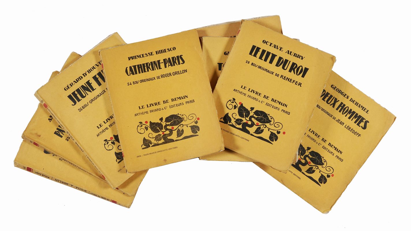 8 volumi in-8°(mm 238x190). Ogni volume contiene numerose xilografie in bianco e nero nel testo. Esemplari in barbe con sporadiche fioriture e altri piccoli difetti ma nel complesso buono stato conservativo. Brossura editoriale con titoli impressi in nero e vignetta xilografica in rosso e nero al piatto anteriore. Parzialmente staccato il piatto anteriore del volume n°51. Compongono la serie: Corthis André, Le Pardon Prématuré. 25 boix originaux de P. Vigoureux; Harry Myriam, Siona à Berlin. 35 bois originaux de J. Lébédeff (n.51); Bibesco Princesse, Catherine-Paris. 34 bois originaux de R. Grillon (n.76); D'Houville Gérard, Jeune fille. 36 bois originaux de Renefer (n.79); Aubry Octave, Le lit du roi. 28 bois originaux de Renefer (n.111); Duvernois Henri, Les soeurs Hortensias. 31 bois originaux de R. Ben Sussan (n.117); Imann Georges, Le tourmenteur roman. 39 bois originaux de R. Grillon (n.118); Duhamel Georges, Deux hommes. 40 bois originaux de J. Lébédeff (n.124).