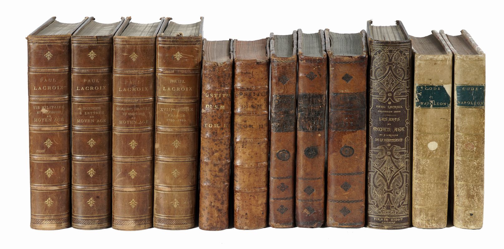 Compongono il lotto: 1) Codice Napoleone ossia collezione compita di tutte le leggi componenti il codice civile [...] Volume primo (-secondo). Torino: Domenico Orgeas, 1806; 2) Pansoya Giovanni Ignazio, Texte et complèment de la loi ou code Napoléon [...] Volume premier (-troisieme). Turin: Dominique Pane, 1810-11; 3) Leggi e costituzioni di sua maestà. Tomo primo (-secondo). In Torino: nella stamperia reale, 1770; 4) Lacroix Paul, Les arts au Moyen Age... Paris: Firmin Didot frères, 1871; 5) Id., XVIIIme Siècle, institutions, usages et costumes... Paris: Firmin Didot frères, 1885; 6) Id., Vie militaire et religieuse au Moyen Age... Paris: Firmin Didot, 1877; 7) Id., Sciences & lettres au Moyen Age... Paris: Firmin Didot, 1877; 8) Id., Moeurs, usages et costumes au Moyen Age... Paris: Firmin Didot, 1878.
