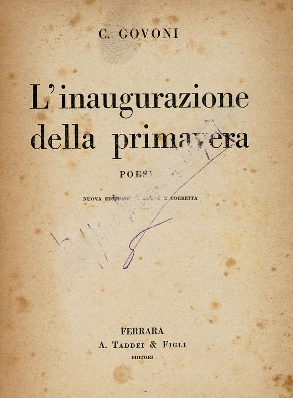 Compongono il lotto: 1) Govoni Corrado, Il pane degli Angeli. Napoli: clet, 1940. 2) Id., Inaugurazione della primavera. Ferrara: Taddei, S.d. 3) Id., La cicala e la formica. Milano: Bottega di Poesia. 1925. 4) Id., Confessione davanti allo specchio. Brescia: Morcelliana, 1943. 5) D'Alba Avro, La tortura della grazia. Roma: Sindacato italiano arti grafiche, 1932. 6) Id., Nostalgie d'Amore. Milano: Bottega di Poesia, 1925. 7) Buzzi Paolo, La danza della Jena. Milano: Vitigliano, s.d. 8) Verdone Mario, Anton Giulio Bragaglia. 1965. 9) Marinetti Filippo Tommaso, Tacito, De origine et situ Germanorum. Garzanti, 1947.