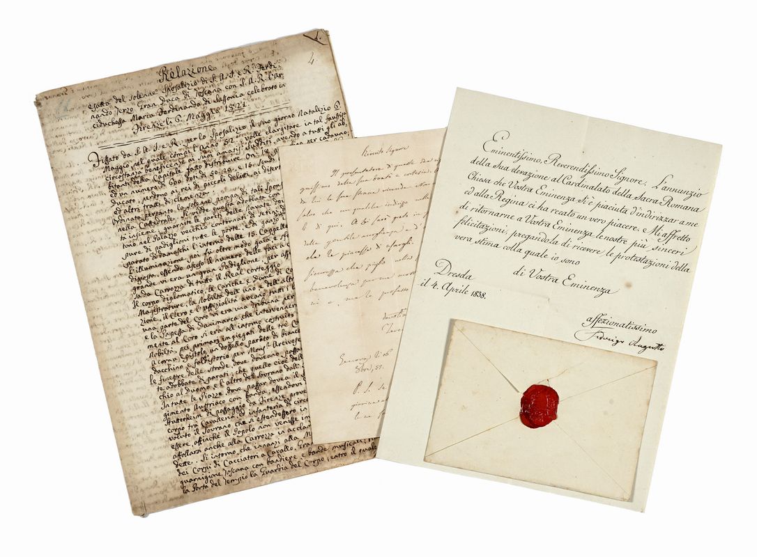 Manoscritti a inchiostro nero. 1 documento a stampa con grande sigillo in carta perfettamente conservato. Dimensioni varie. SI AGGIUNGE: “Relazione esatta del solenne Sposalizio di S. A. I. e R. Ferdinando Terzo Gran Duca di Toscana con [...] Maria Ferdinanda di Sassonia celebrato il 6 maggio 1821” (manoscritto).