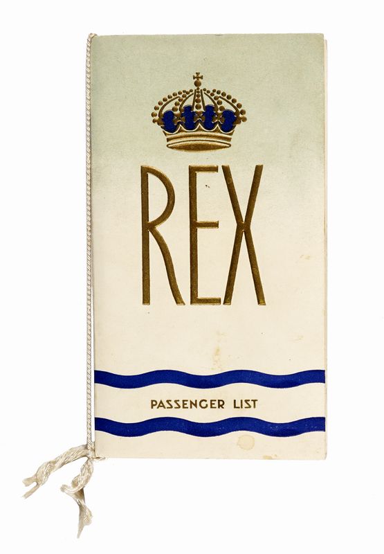 In-8° (mm 192x100). Grazioso opuscolo in pieno cartonato contenente: 1 carta con le informazioni sull'equipaggio, 6 carte con le Informazioni generali (in italiano e in inglese), 4 carte con la Passengers list, 4 con la lista dei servizi. In allegato un interessante Cedola per l'Espatrio e per il Rimpatrio.