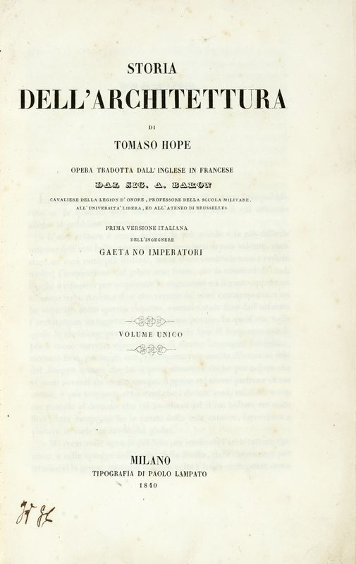 1 volume di testo e 1 di tavole in-8° (mm 250x150). Esemplare in barbe con lievi difetti. Rimontato il volume di tavole. Legatura in mezza pelle, con titoli in oro al dorso. Abrasioni, ma nel complesso buone condizioni.