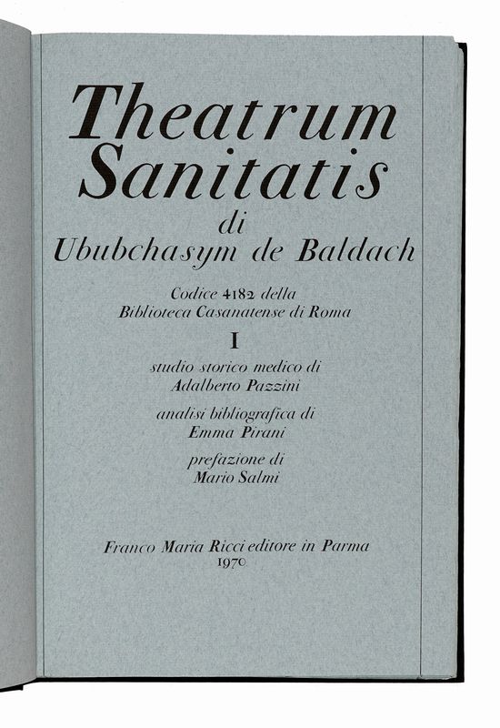 In-4° (mm 350x230). Con numerose illustrazioni a colori applicate nel testo. Legatura originale in piena tela, con titoli in oro e illustrazioni applicate al piatto anteriore. Entro custoria editoriale in pieno cartonato nero. SI AGGIUNGE: Baldach Ububchasym (de), Theatrum sanitatis […] Vol. I (-III). Parma: Franco Maria Ricci, 1970. 3 volumi in-4° (mm 350x230).