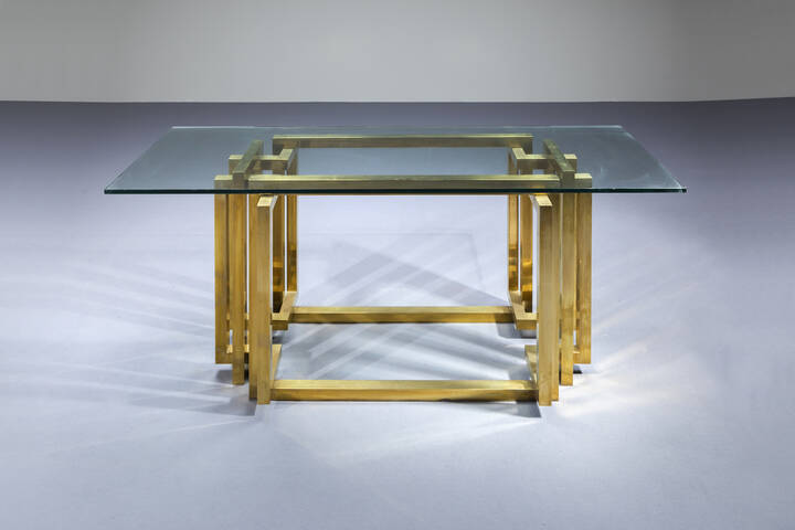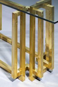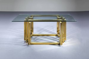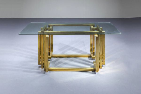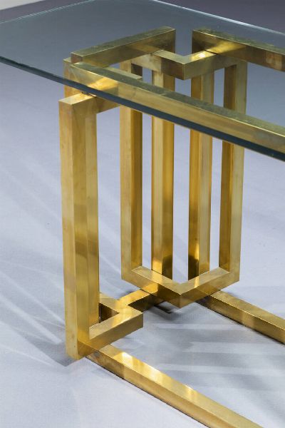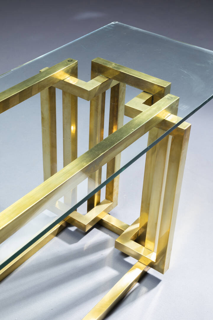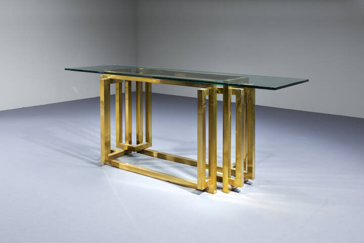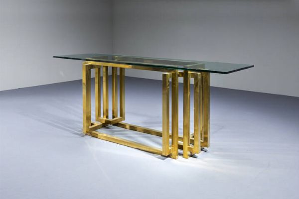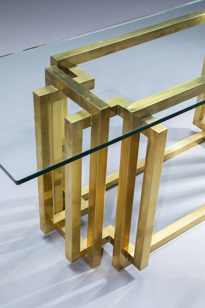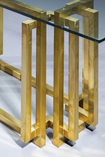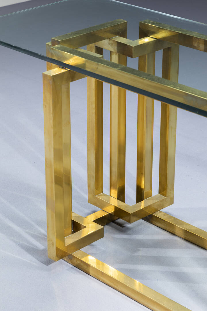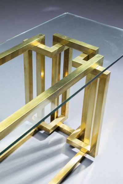 Console con struttura in ottone a forma geometrica piano in vetro. Anni '70 cm [..]