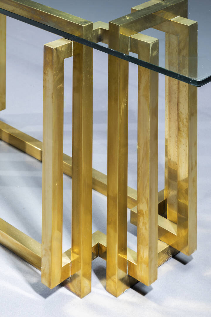 Console con struttura in ottone a forma geometrica piano in vetro. Anni '70 cm 73x180x59