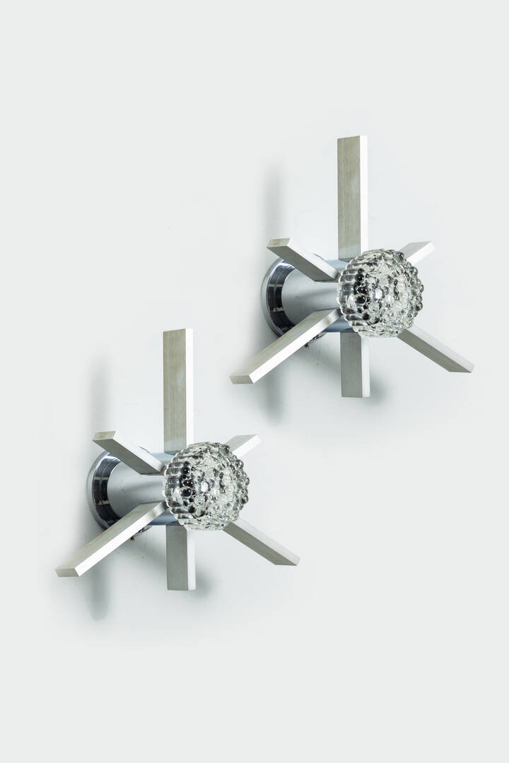 Coppia di appliques in metallo cromato diffusori in vetro. Anni '50 h cm 18