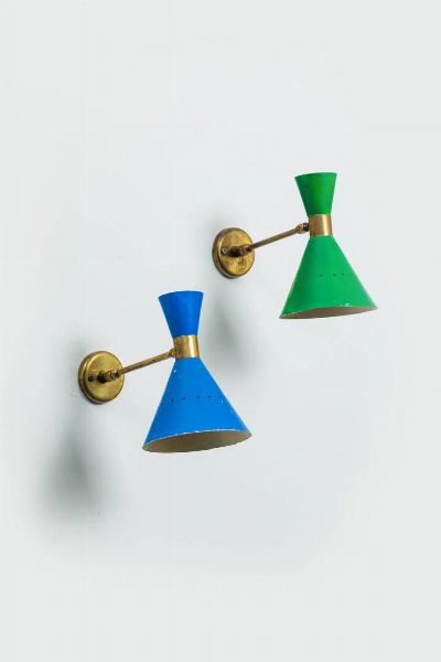 Coppia di lampade a parete in ottone diffusore a doppio cono in metallo verniciato. [..]