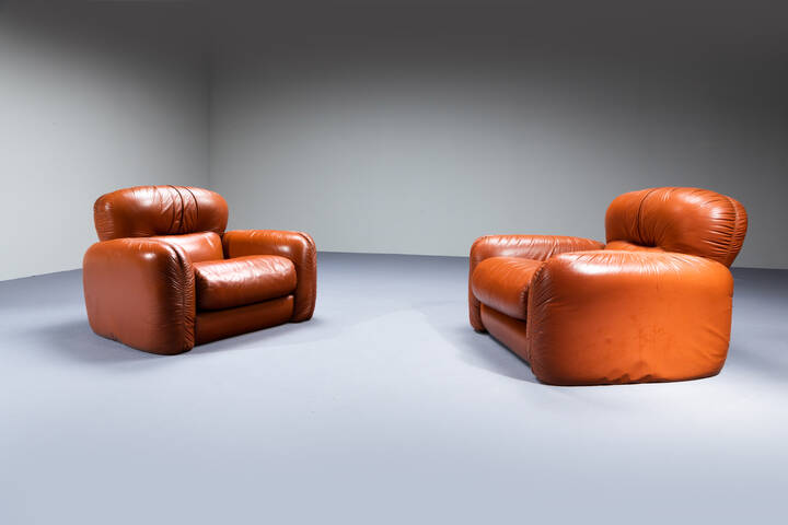 Coppia di poltrone con imbottitura rivestita in pelle. Anni '70 cm 78x93x80