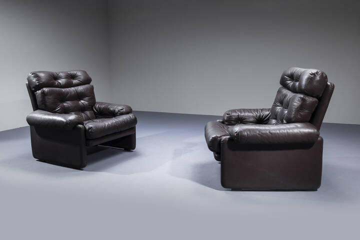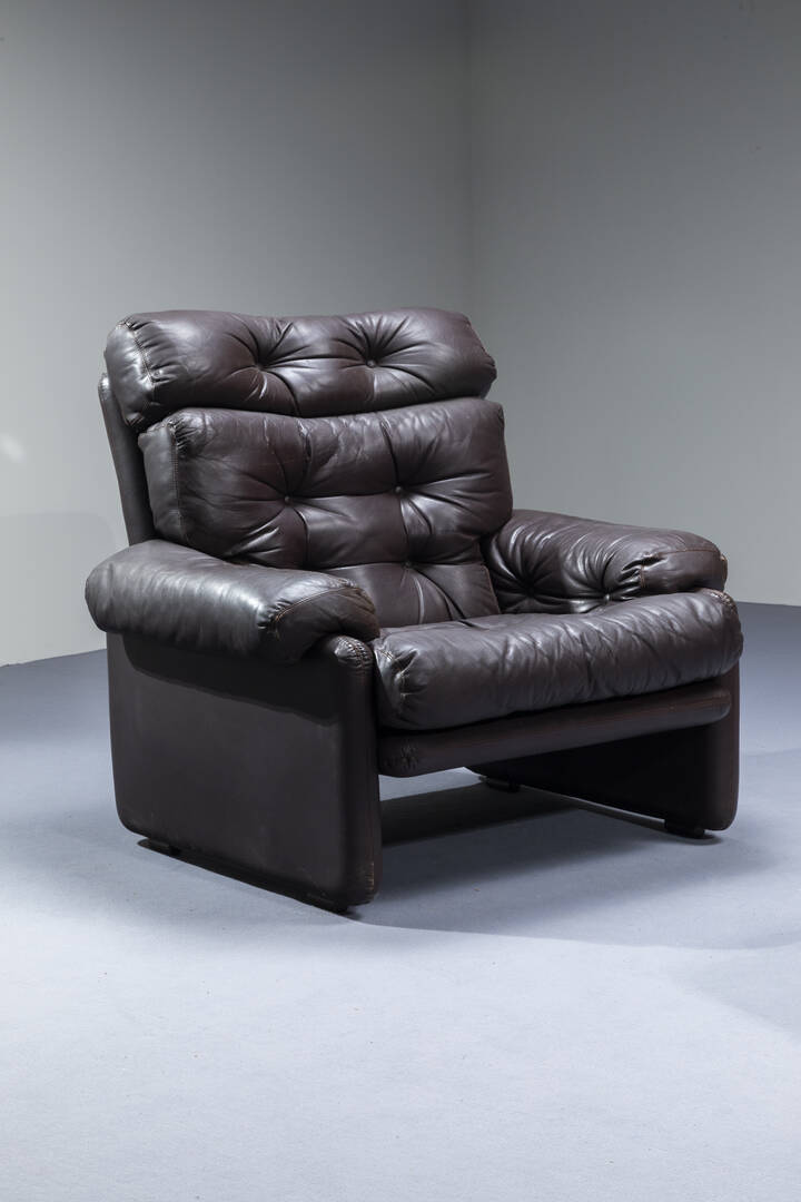 Braccioli in lamiera stampata sedile in tubolare metallico e conghie elastiche imbottitura rivestita in pelle. Prod. B&B anni '70 cm 75x90x90 Bibl.: Giuliana Gramigna Repertorio del Design Italiano1950-2000 Allemandi 2011 pag. 122