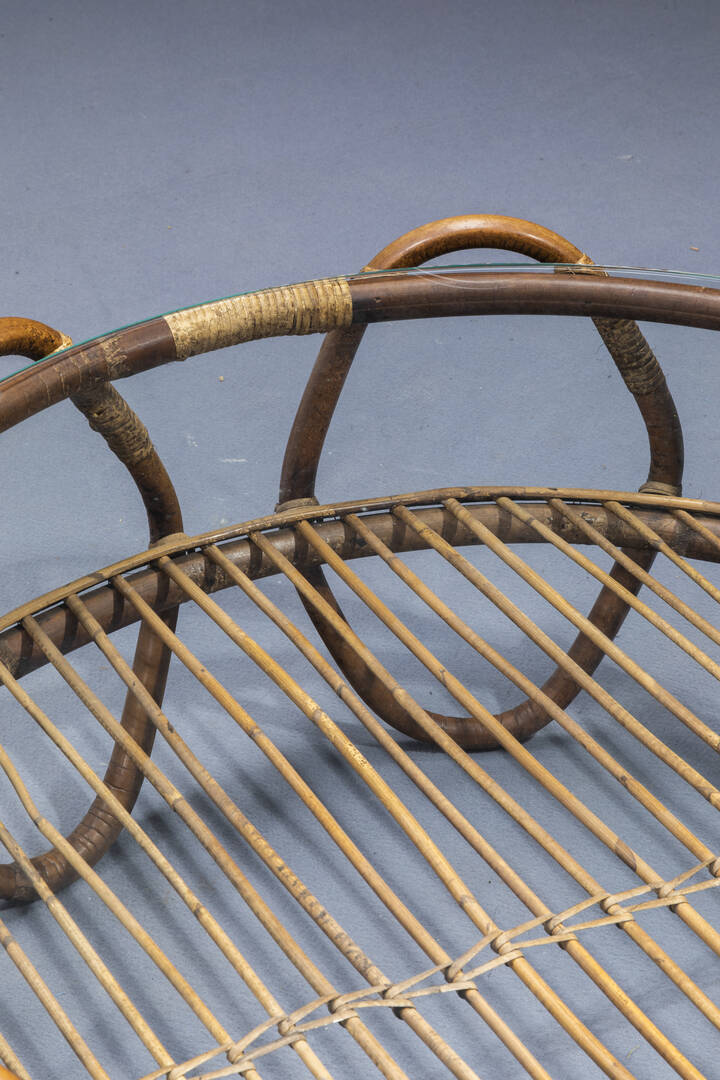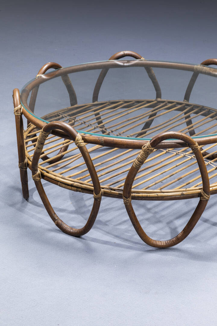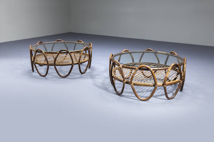 Coppia di tavolini in bamboo. Anni '50 cm 38x84
