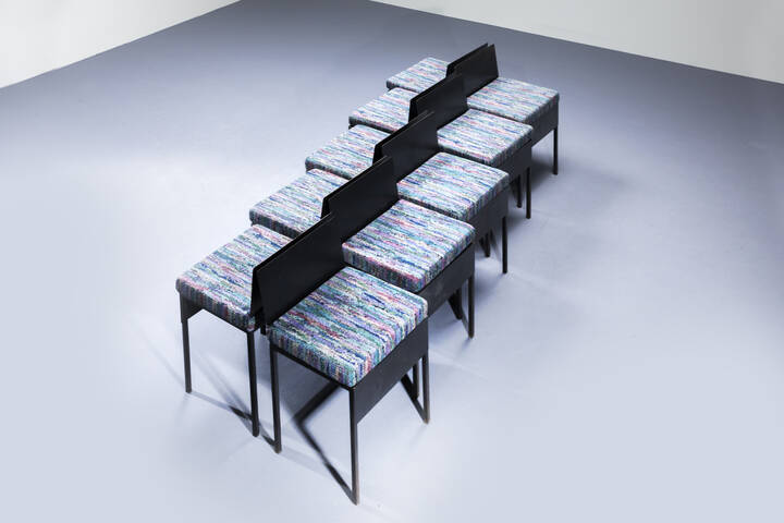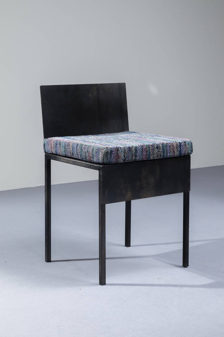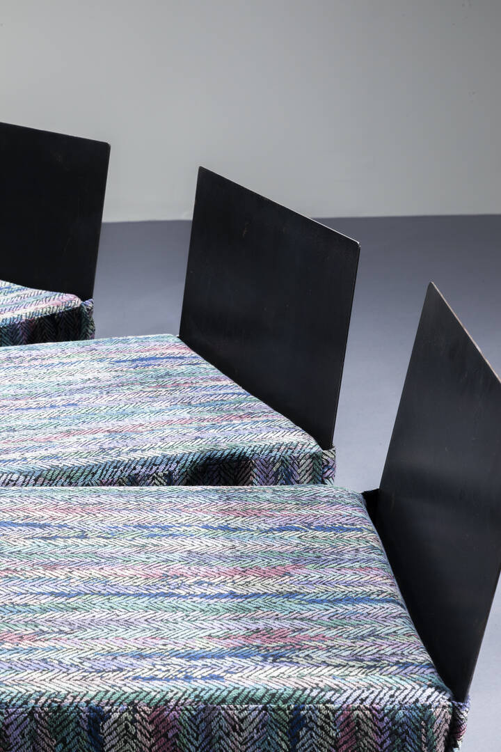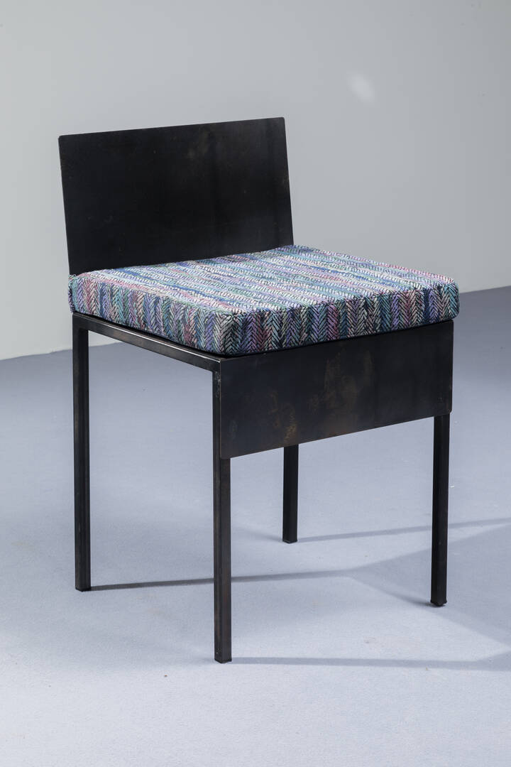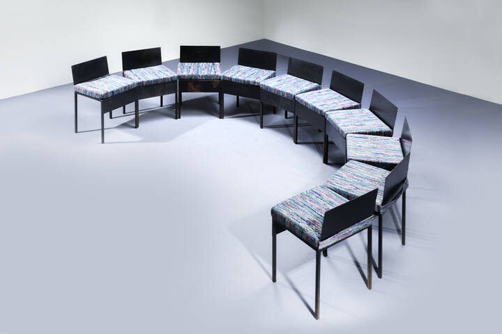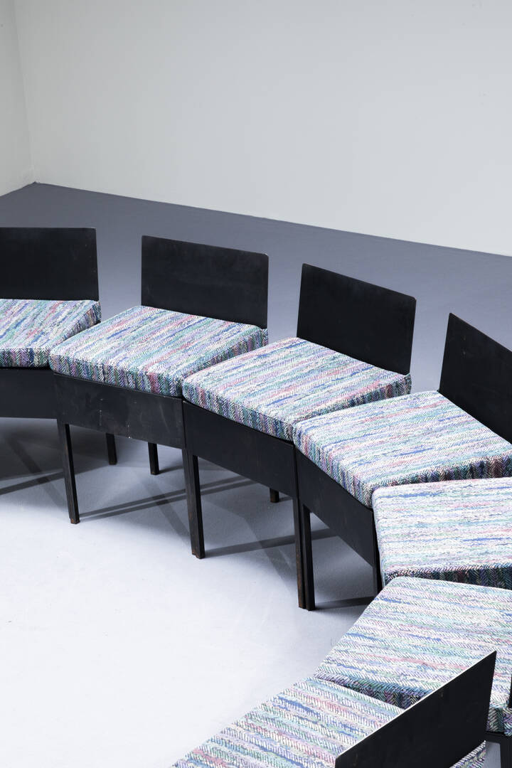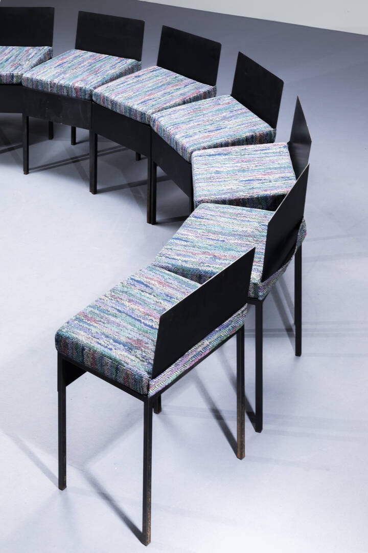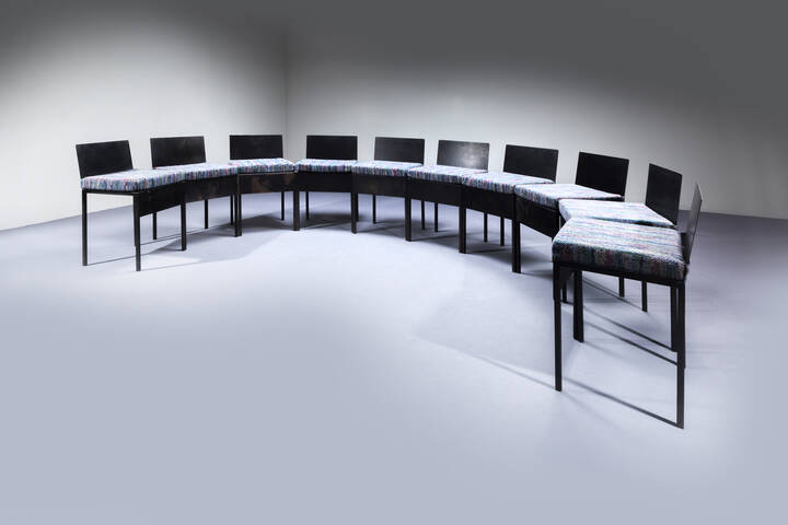 Dieci sedie con struttura in ferro verniciato cuscini imbottiti rivestit con tessuto Missoni. Anni '80 cm 74x45x40