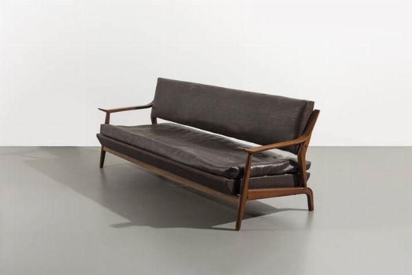 Divano con struttura in legno imbottitura rivestita in similpelle. Anni '50 cm [..]