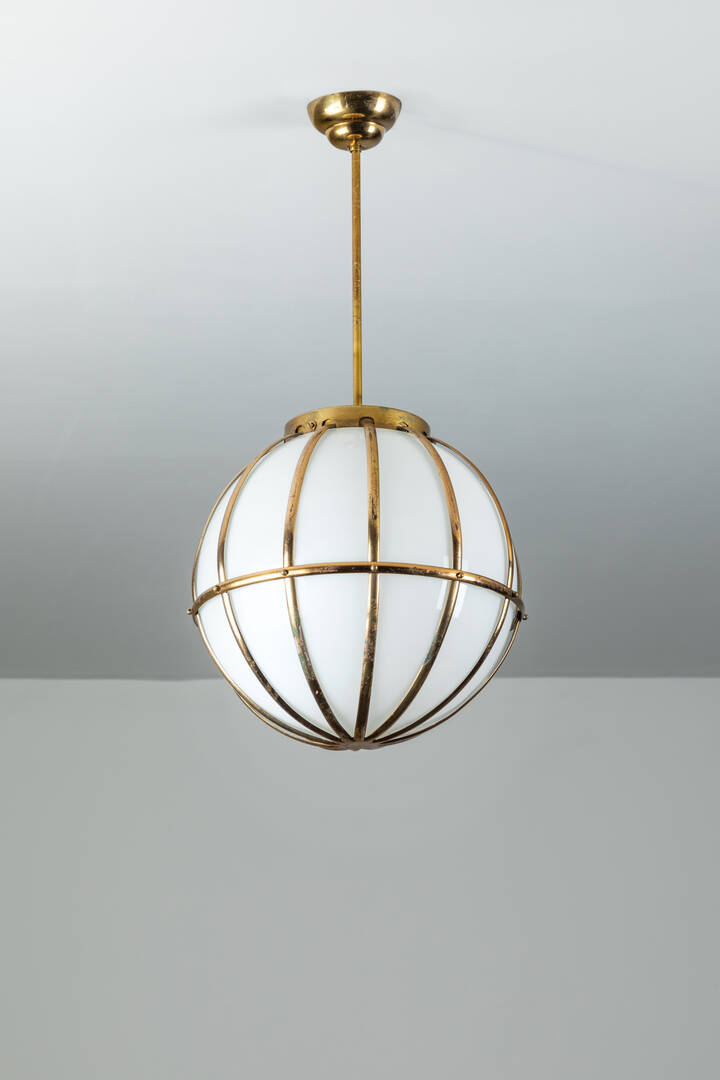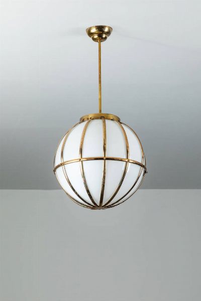 Lampada a sospensione in ottone diffusore in vetro opalino. Anni '50 cm 75x38
