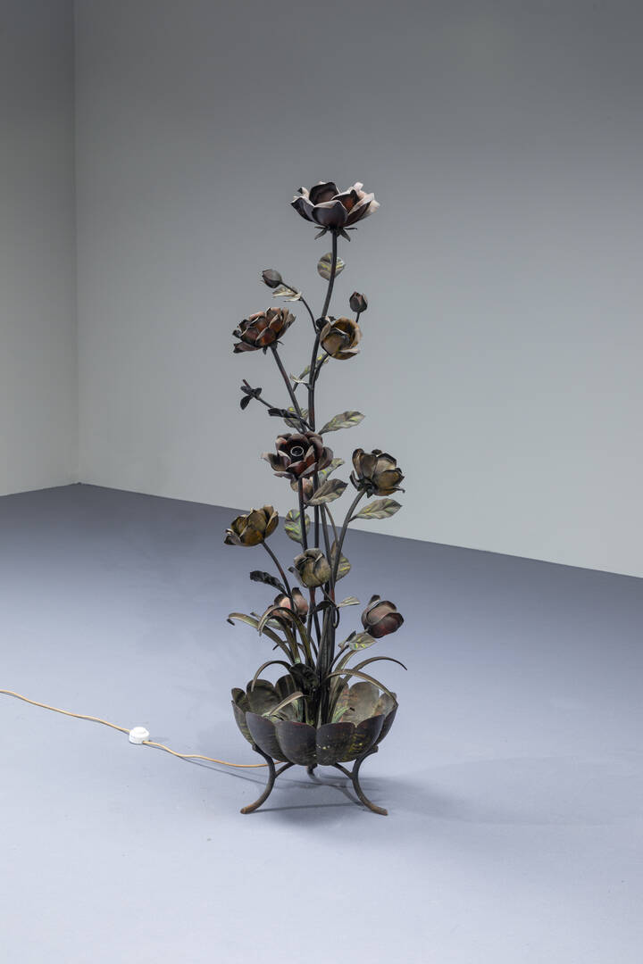Lampada da terra in ferro verniciato modellato a rami di rose. Anni '60 h cm 138