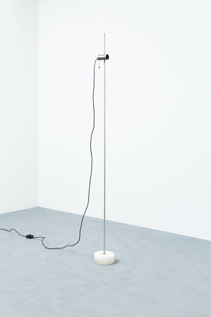 Stelo in acciaio base in travertino. Prod. Oluce di Giuseppe Ostuni anni '60 h cm 193 Bibl.: Giuliana Gramigna Repertorio 1950-1980 Mondadori 1985 pag. 87