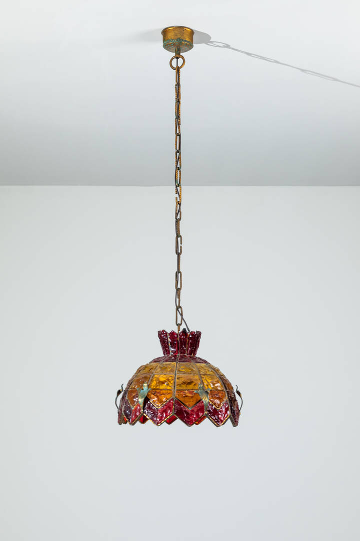 Lampadario con struttura in metallo e vetro colorato. Anni '60 cm 36x36