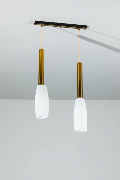 Lampadario con struttura in ottone e due pendenti in vetro. Anni '50