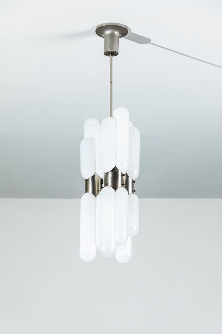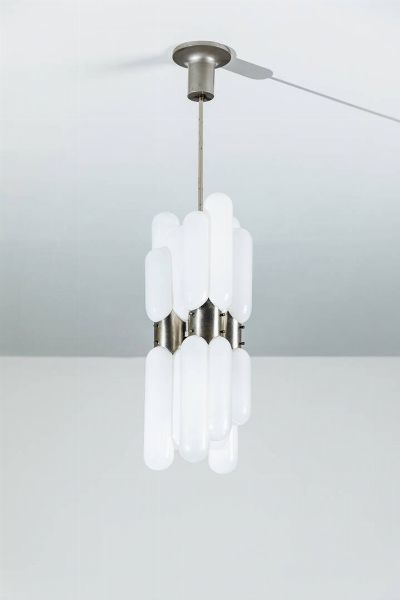 Lampadario in metallo cromato diffusori in vetro opalino h cm 57