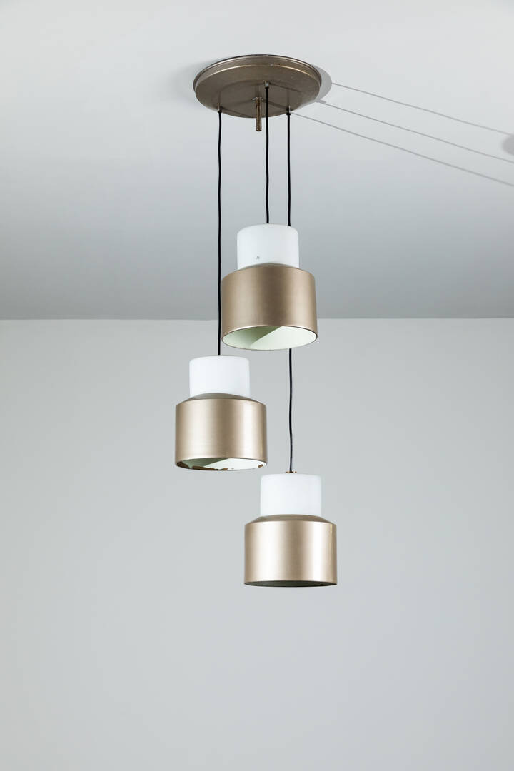 Lampadario in metallo verniciato diffusori in vetro satinato. Pord. Arteluce anni '70 Etichetta del Produttore h. cm 136