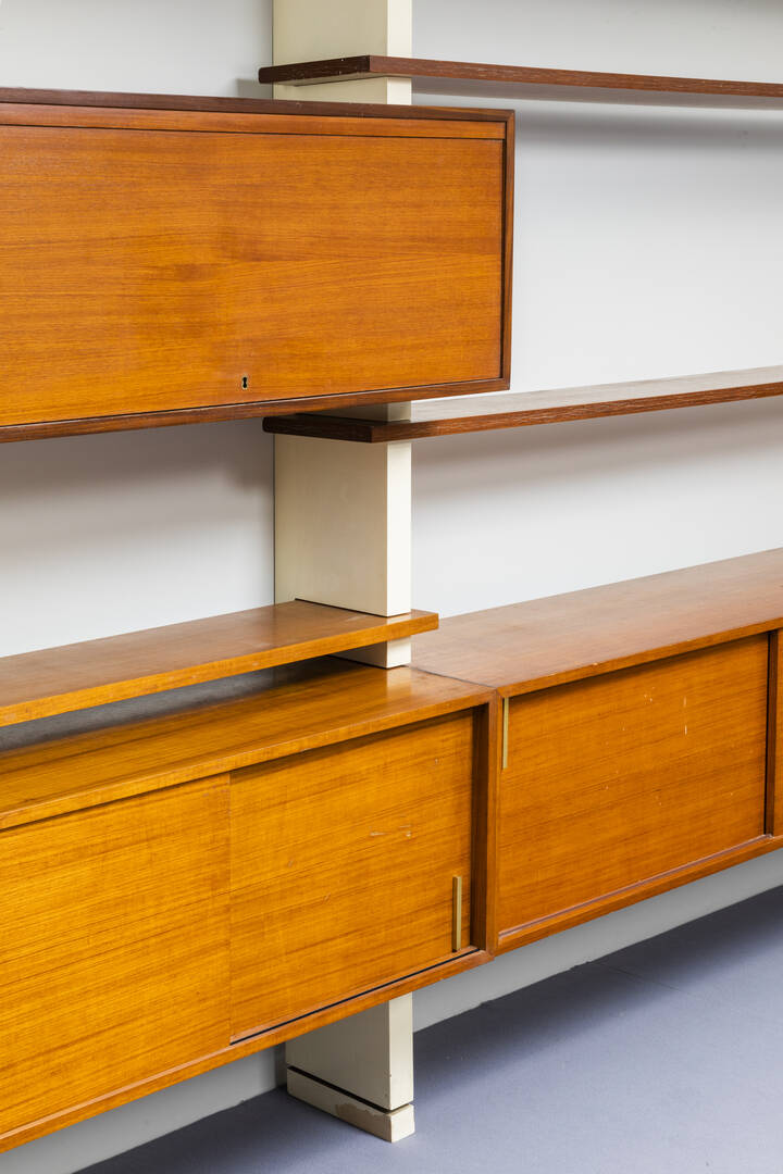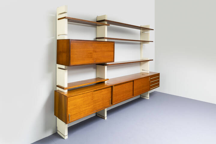Libreria con montanti in legno laccato moduli in legno con particolari in ottone. Anni '60 cm 237x330x52