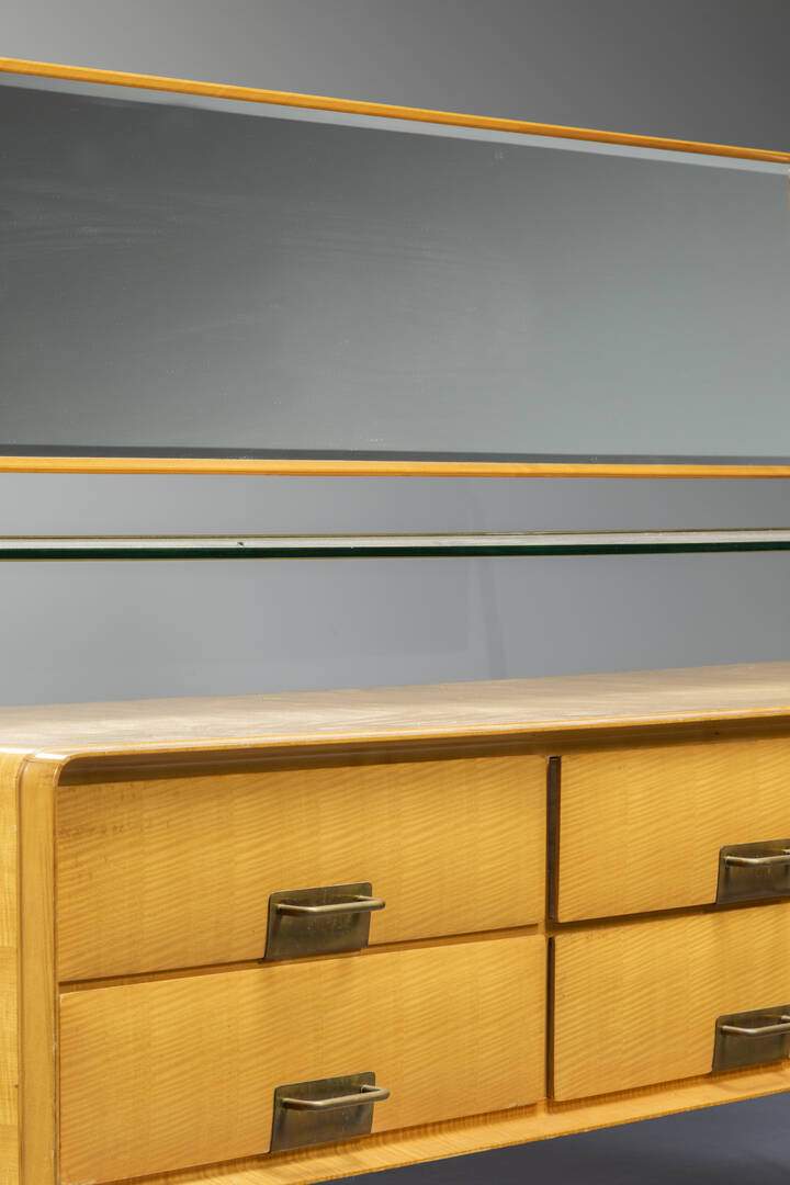 Mobile contenitore in legno d'acero ottone nichelato e piano in vetro. Anni '50 cm 118x187x49