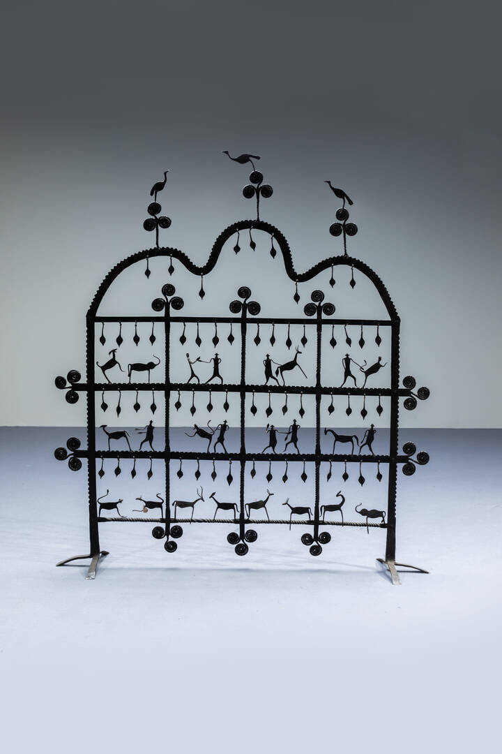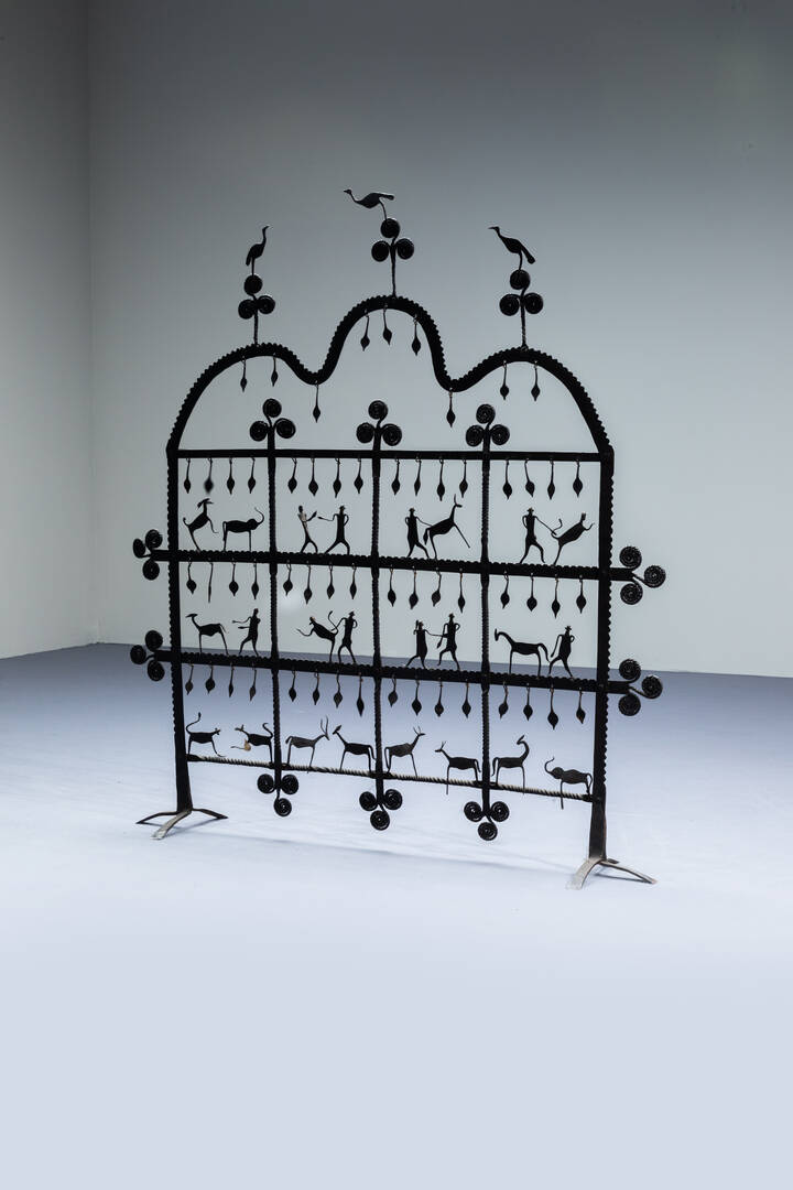Pannello decorativo in ferro battuto con decorazioni di figure primitive stilizzate. [..]