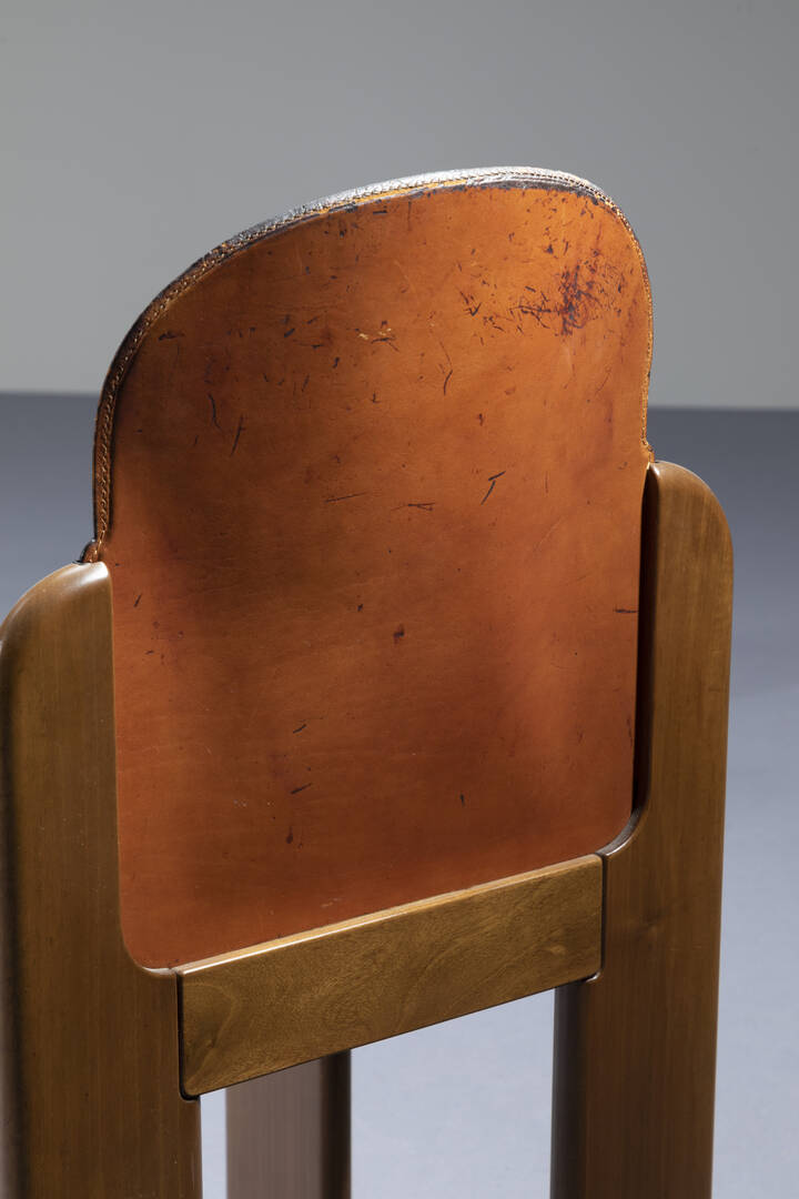 Quattro sedie con struttura in legno schienali e sedili rivestiti in cuoio. 1975 [..]