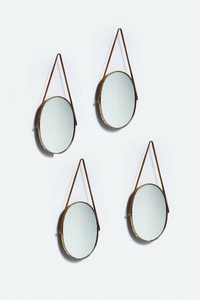 Quattro specchi con bordo in ottone e particolari in cuoio. Anni '50 cm 40x35