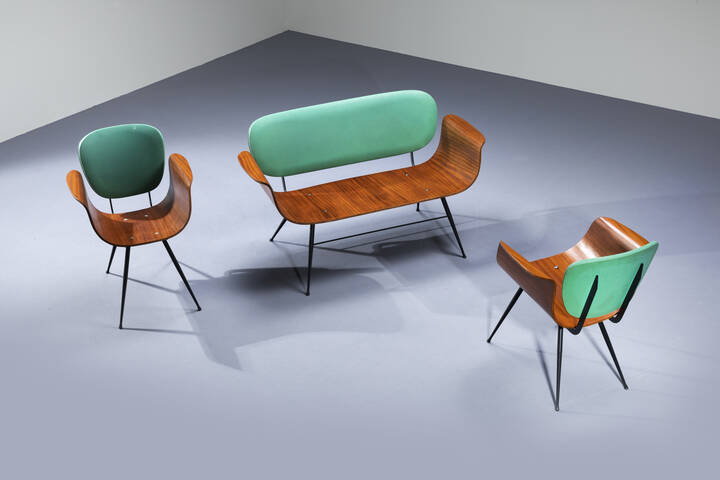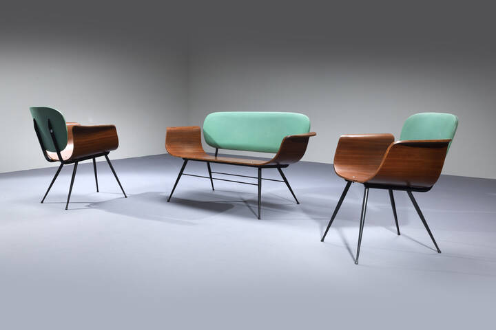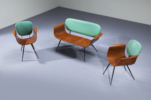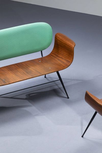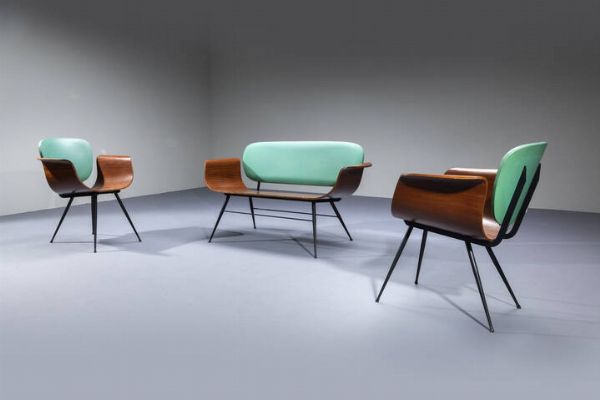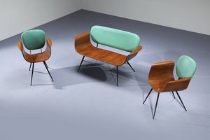 Salotto composto da un divanetto e due poltrone in metallo verniciato compensato [..]