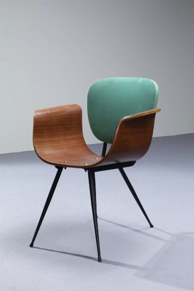 Salotto composto da un divanetto e due poltrone in metallo verniciato compensato curvato schienale imbottito rivestito in skai verde. Anni '60 divano cm 70x124x46 poltrone cm 70x60x46