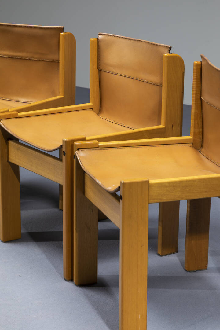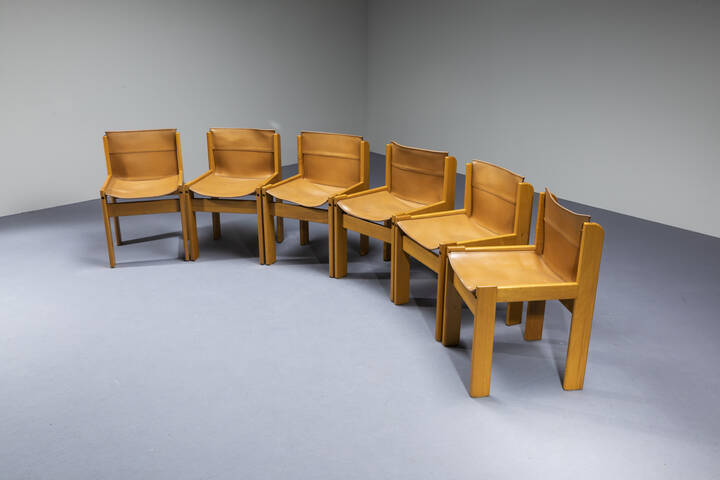 Sei sedie con struttura in legno sedute e schienali in cuoio. Anni '70 cm 79x48x [..]