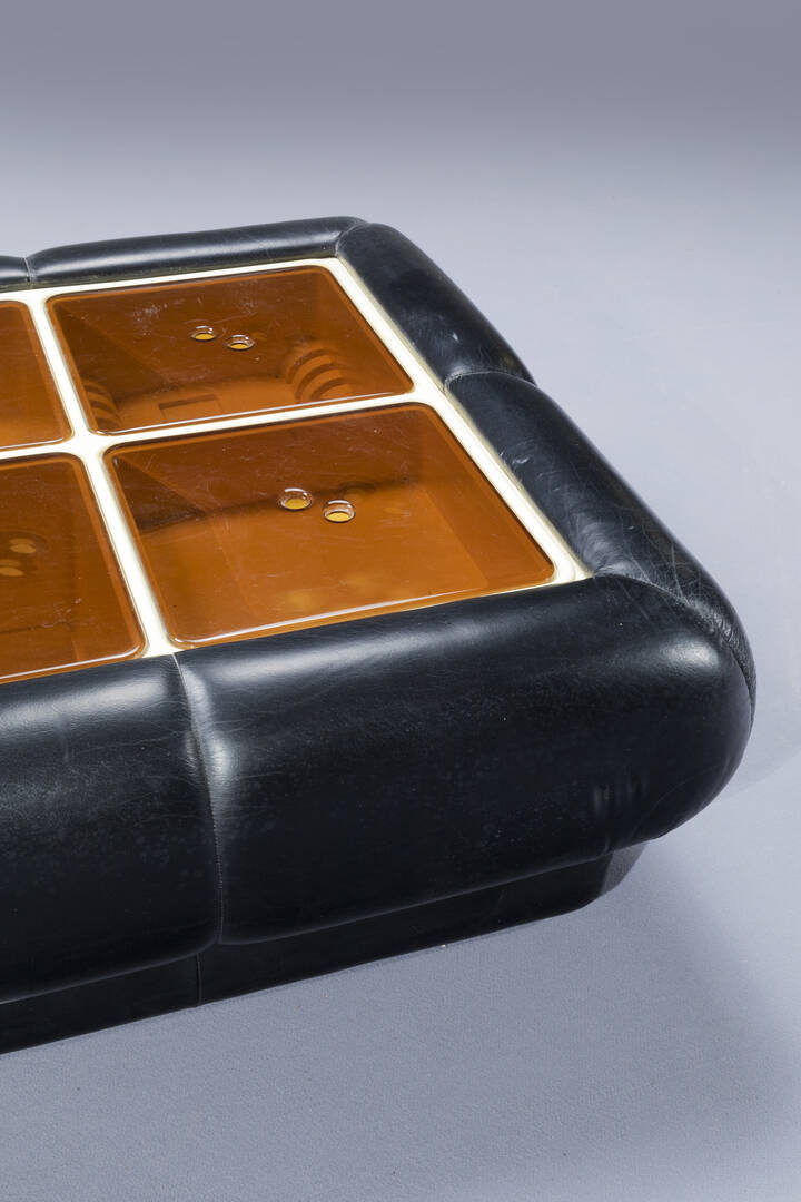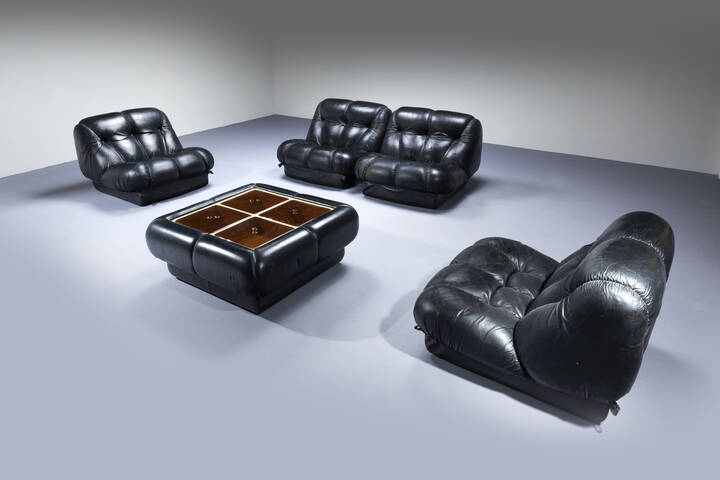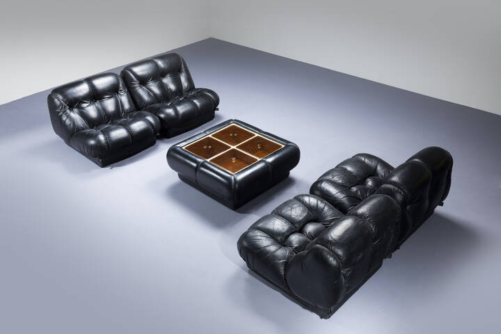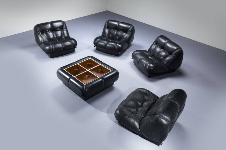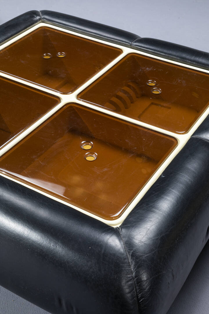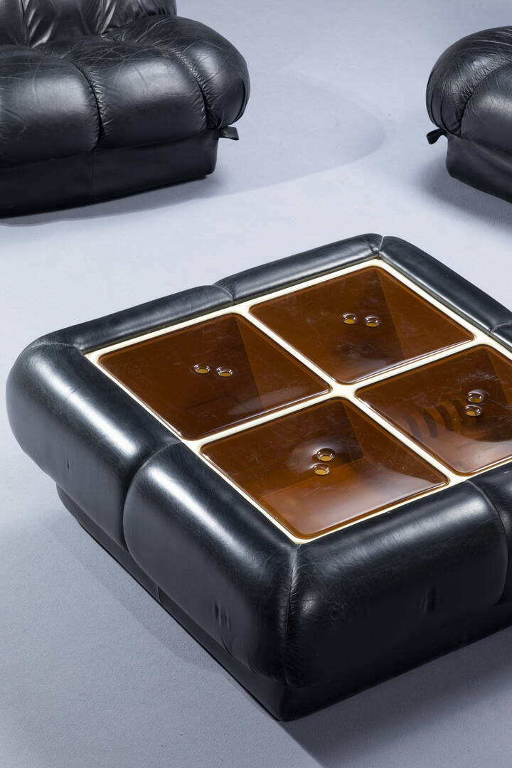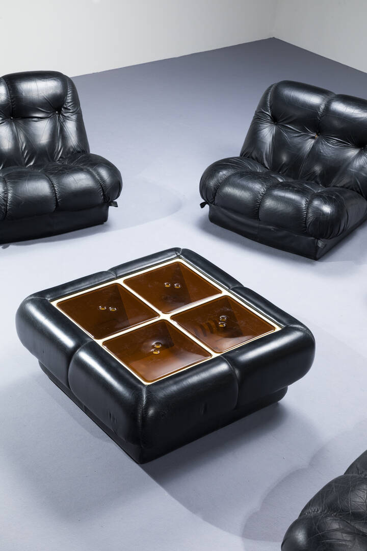 Sistema modulare composto da quattro poltrone e un tavolino rivestiti in pelle. Prod. Mimo Padova anni '70 Marcate sotto la base poltrone cm 61x86x84 tavolino cm 40x90x90