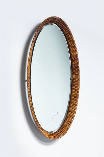 Specchio con cornice in vimini e particolari in ottone. Anni '50 cm 90x47