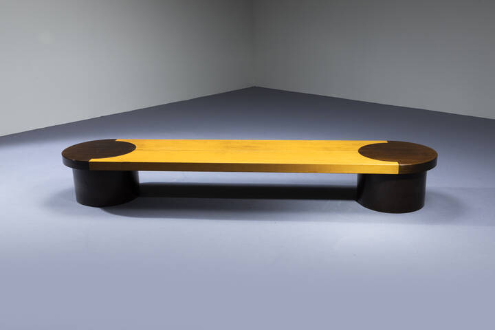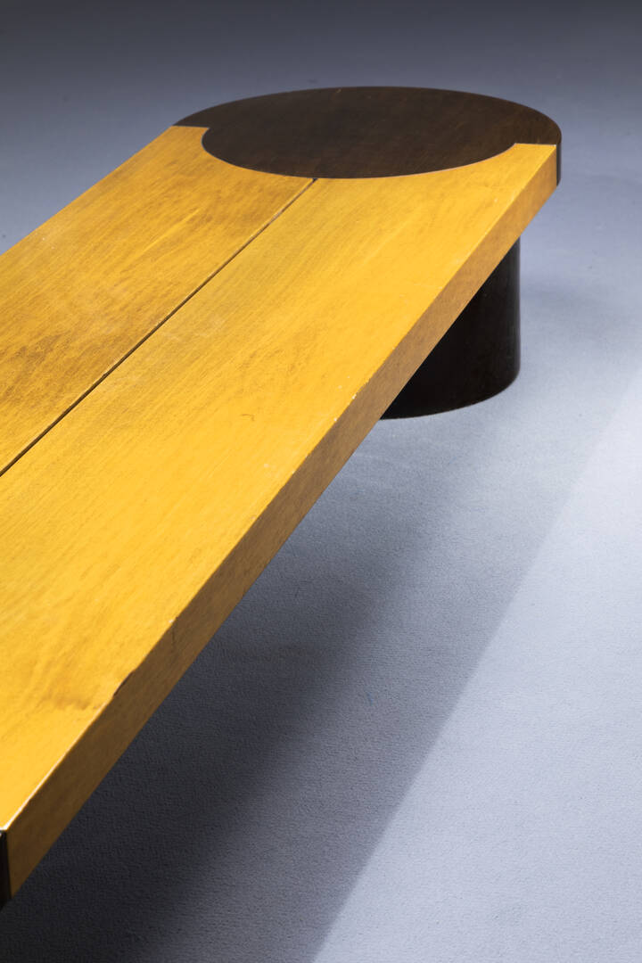 Tavolino in legni di varie essenze. 1975 cm 30x225x50