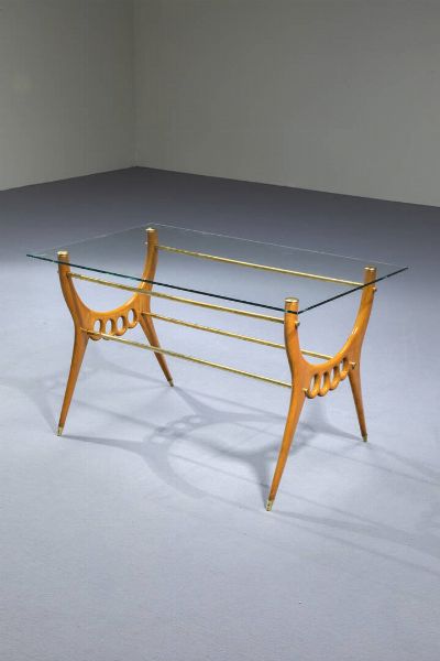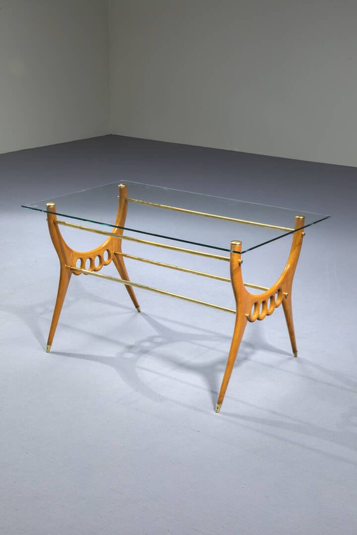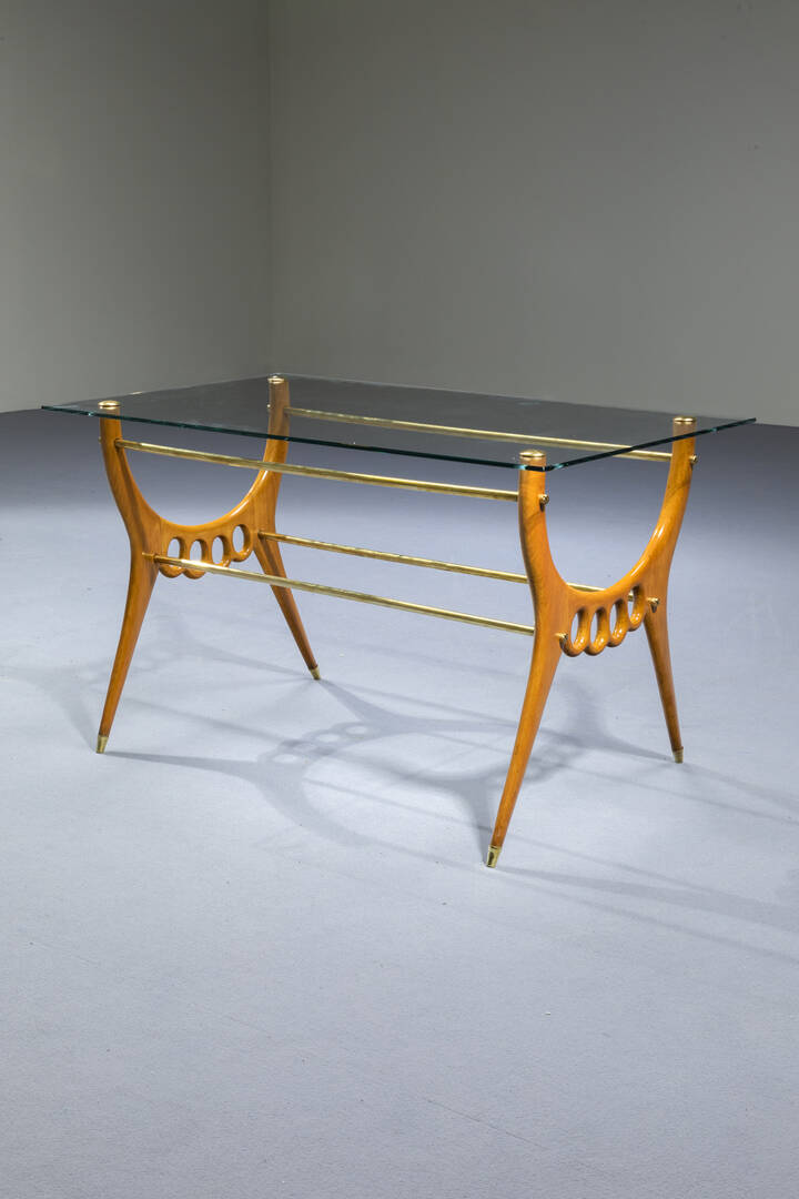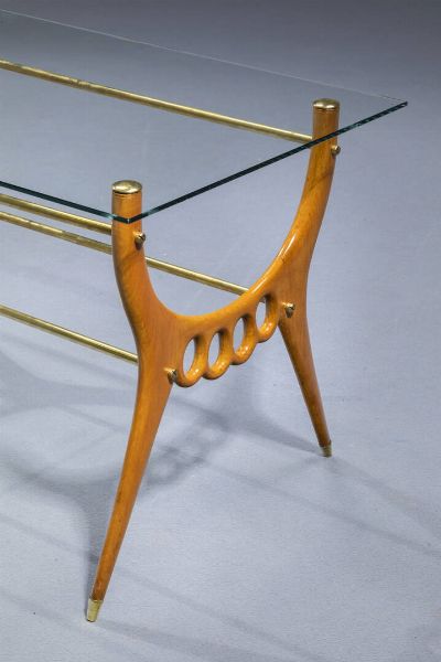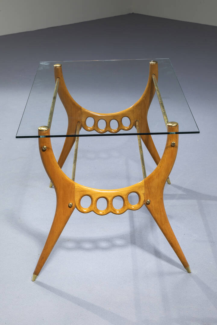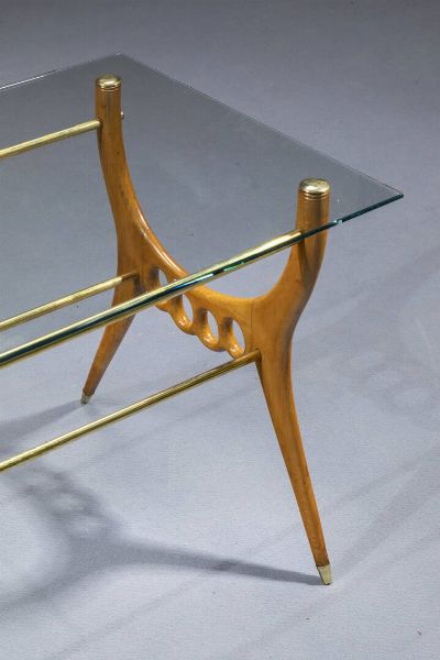 Tavolino in legno con particolari in ottone piano in vetro. Anni '60 cm 50 5x85 [..]