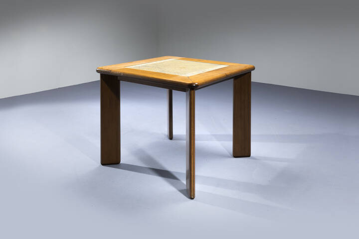 Tavolo con struttura in legno parte centrale in paglia di Vienna ricoperta da vetro. 1975 cm 76x92x92
