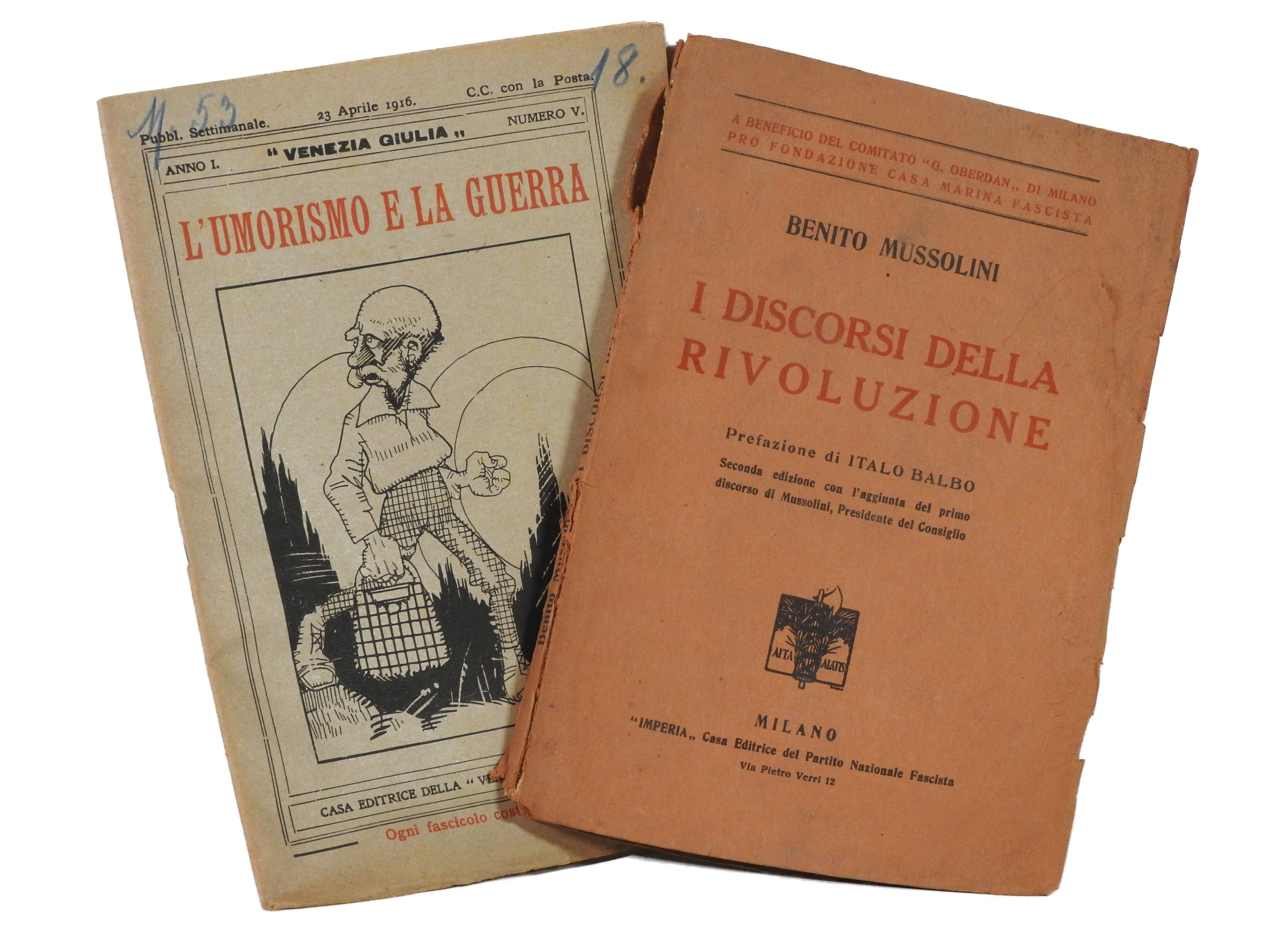 Seconda edizione con l'aggiunta del primo discorso di Mussolini, Presidente del Consiglio, Milano: Imperia, 1923 (gora d'acqua che interessa tutto l'opuscolo). Si aggiunge: L'umorismo e la guerra, a. I, n. V, 23 aprile 1916 (2)
