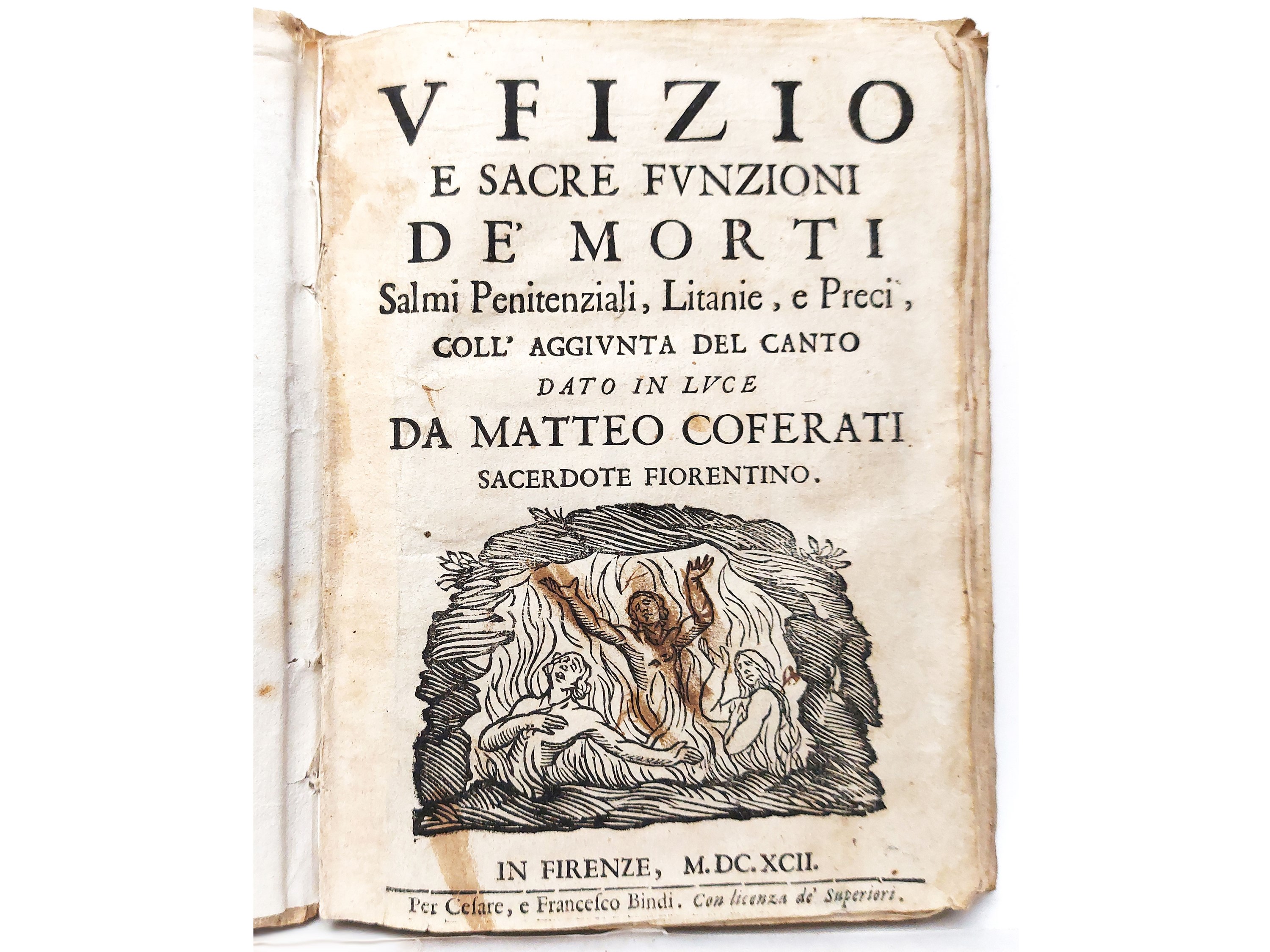 - Ufizio e sacre funzioni de' morti. Salmi penitenziali, Litanie, e Preci coll'aggiunta del canto dato in luce da Matteo Coferati sacerdote fiorentino, In Firenze: per Cesare e Francesco Bindi, 1692, 90 p., con partiture in notazione quadrata. Legatura coeva, molto rovinata, allentata; importanti restauri conservativi, macchie, minime gallerie di tarlo. Ultima pagina manoscritta