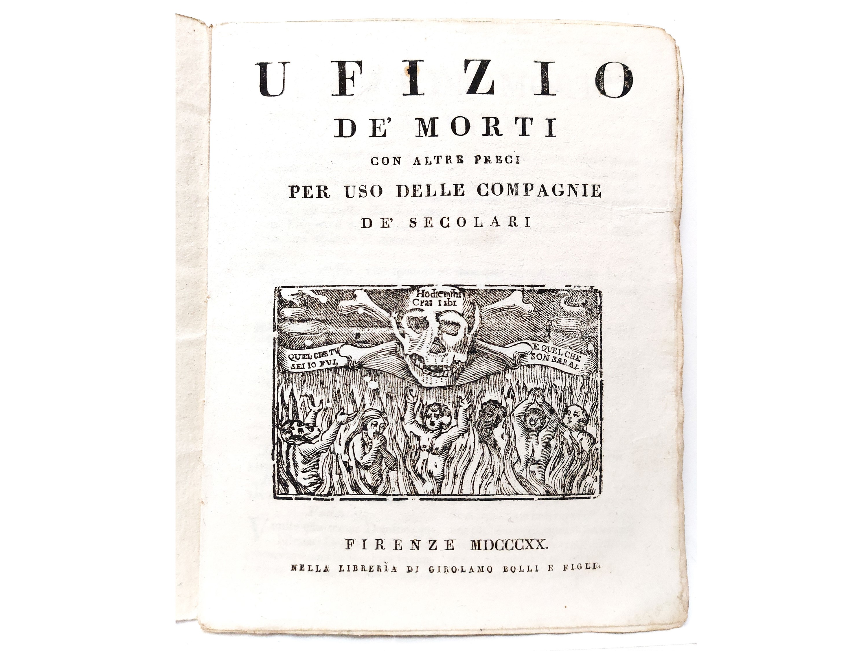 - Ufizio de' morti con altre preci per uso delle compagnie de' secolari, Firenze: nella Stamperia di Girolamo Bolli e figli, 1820, 24 p. Bel frontespizio inciso. Legatura cartonata, non coeva, allentata. Lievi fioriture e macchie