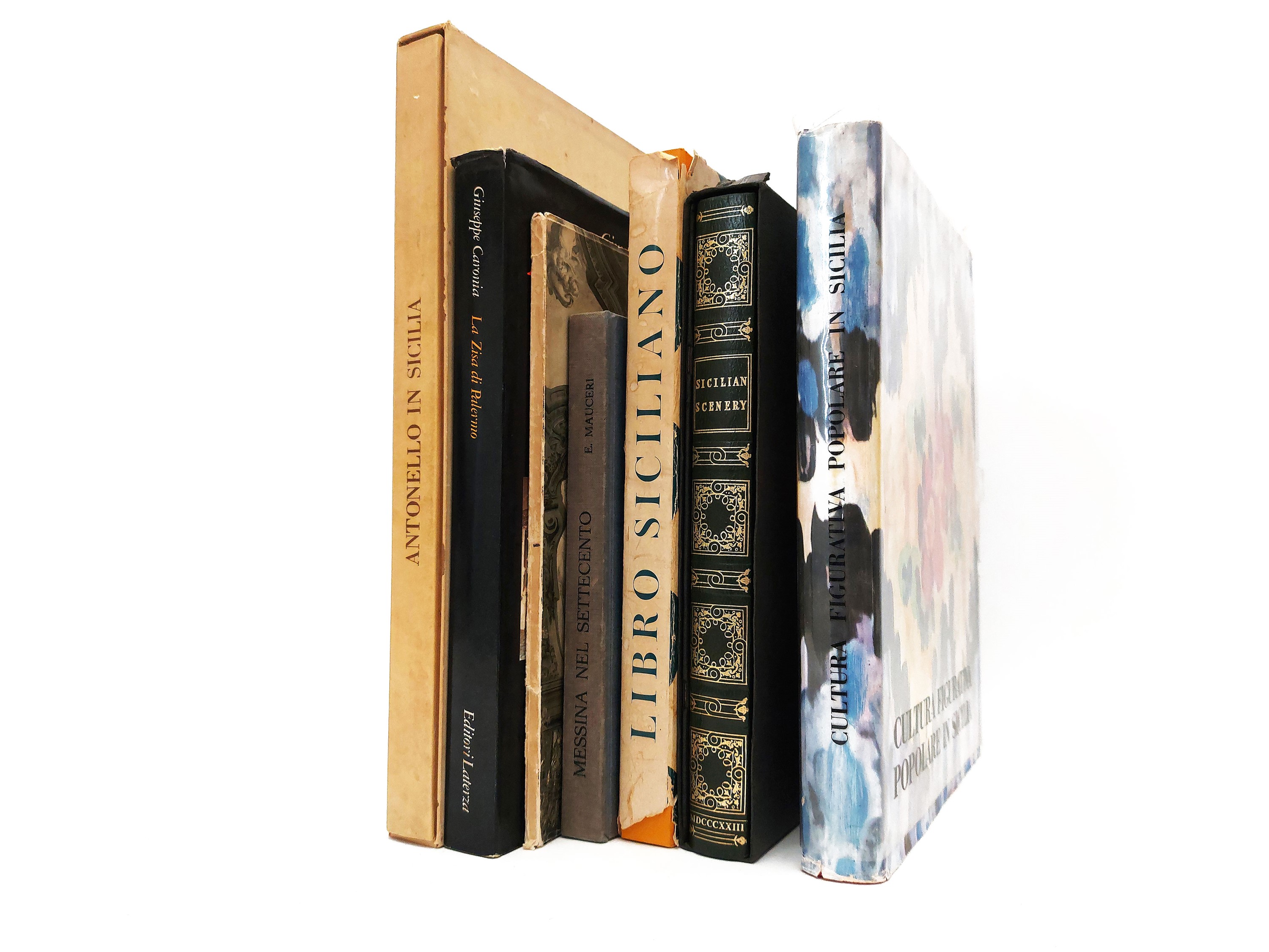 miscellanea di testi tra cui: Antonello in Sicilia, a cura di Marziano Bernardi, ERI, 1957, in cofanetto (foxing) - Cultura figurativa popolare in Sicilia, Flaccovio, 1961 - Sicilian Scenery, Pizzi, 1980, riproduzione dell'edizione Londra, 1823, in cofanetto - Libro siciliano, Flaccovio, 1970. Difetti (7)
