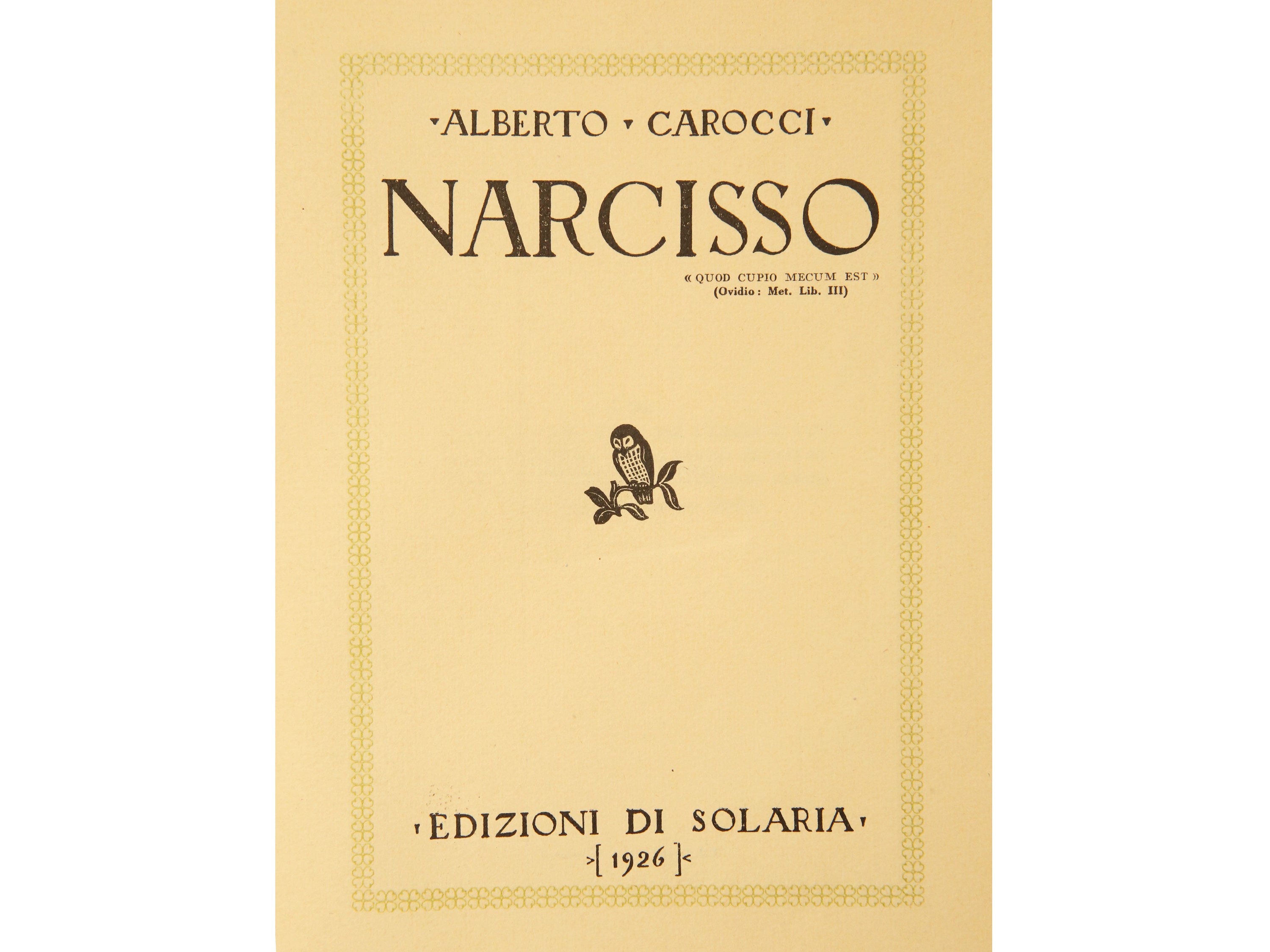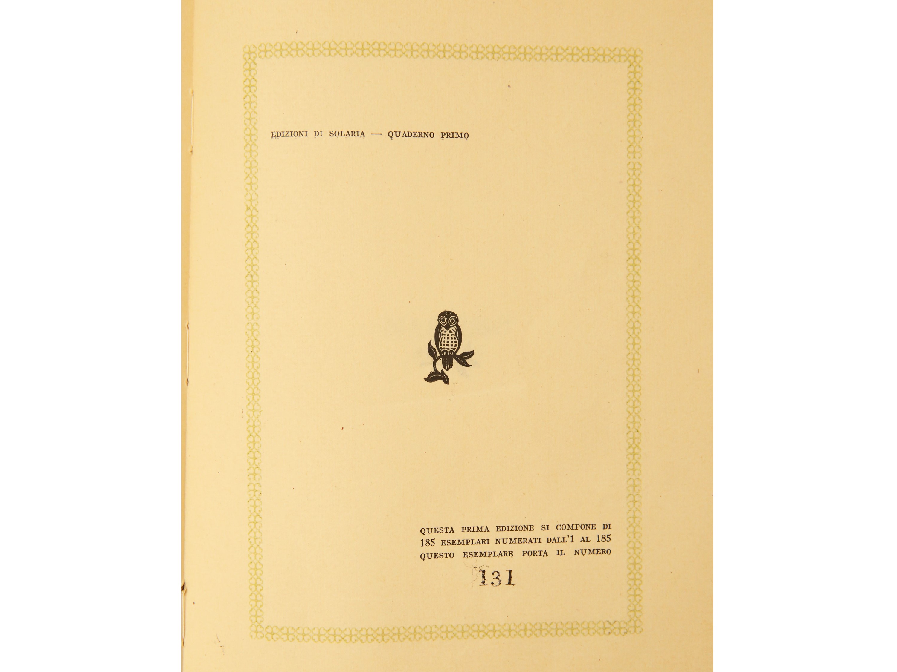 Firenze: Edizioni di Solaria, 1926. Brossura editoriale con titolo entro riquadro e fregio al piatto. Buona copia, qualche piccolo strappetto al dorso. Prima rara edizione, con dedica autografa al risguardo. Quaderno primo delle Edizioni di Solaria, con disegni incisi in legno da Bramanti; edizione di sole 185 copie numerate (ns. 131)