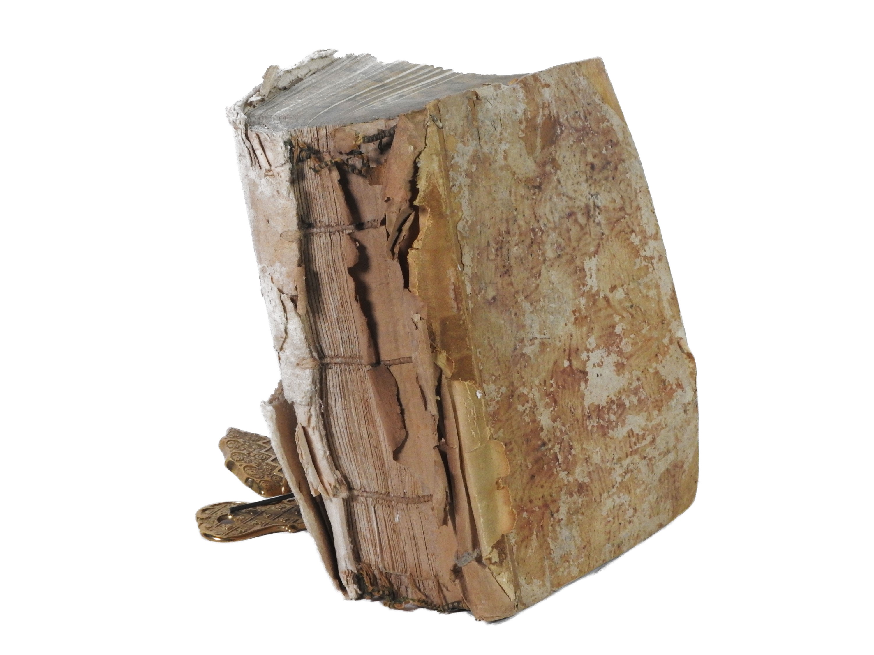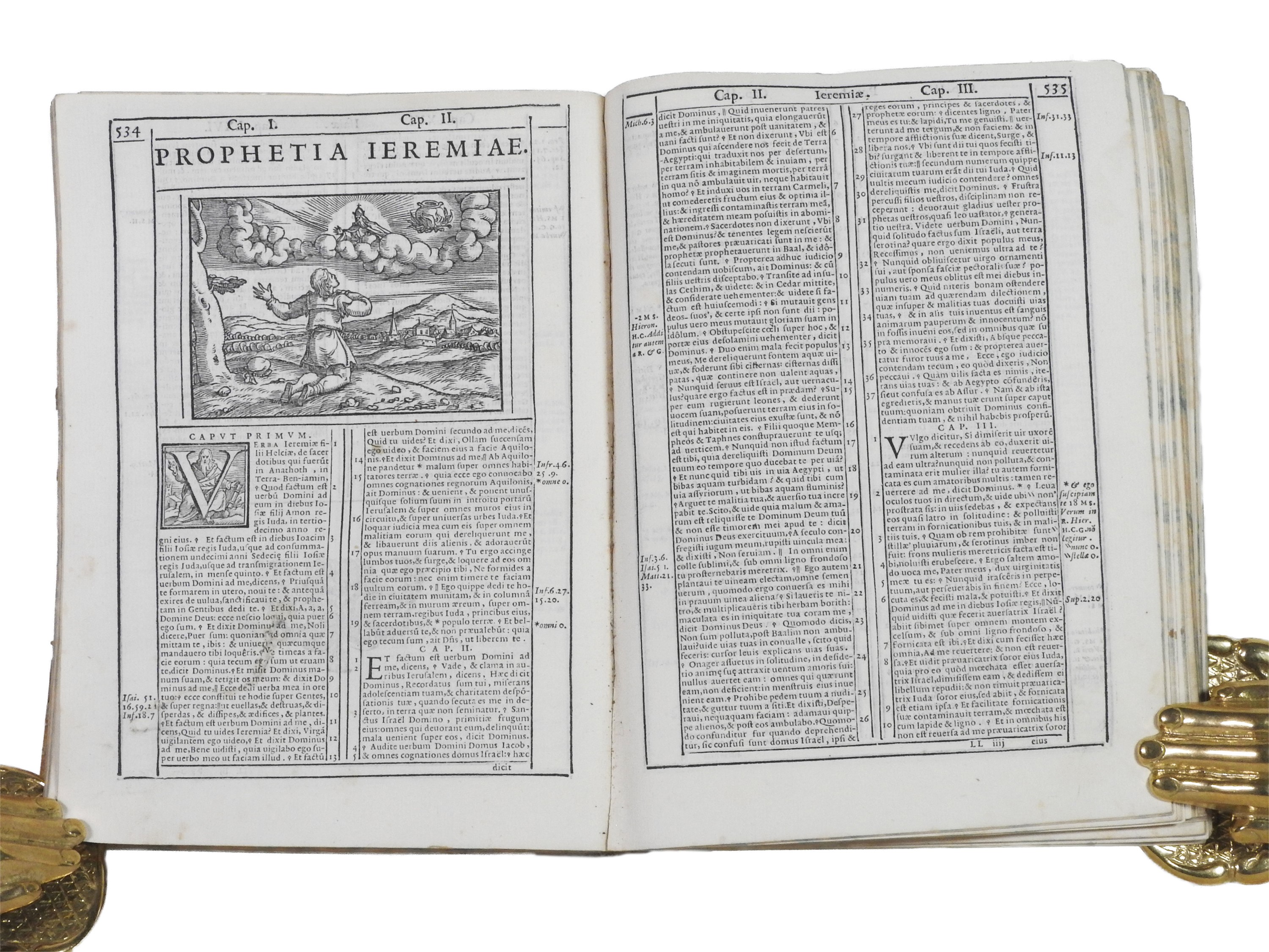 Venetii, Apud Iolitus [Giolito de Ferrariis], 1588, 2 volumi rilegati in 1 volume: Sacra Biblia, acri studio, ac diligentia emendata. Rerum, atque Verborum permultis, & perquamdignis Indicibus aucta, [16], 679 p.; Tomus Secundus Bibliorum, continens Nouum Testamentum, 199 p., [200] p. n.n. di indice. Bella edizione impreziosita da molte illustrazioni xilografiche nel testo, frontespizio, testatine, capilettera e finalini incisi. Testo su due colonne, entro cornice. Legatura estremamente rovinata, assente il dorso e il piatto posteriore. Segni di restauro al frontespizio e su alcune carte. Bruniture, qualche sporadica fioritura, macchie, galleria di tarlo alle pagine dell'indice