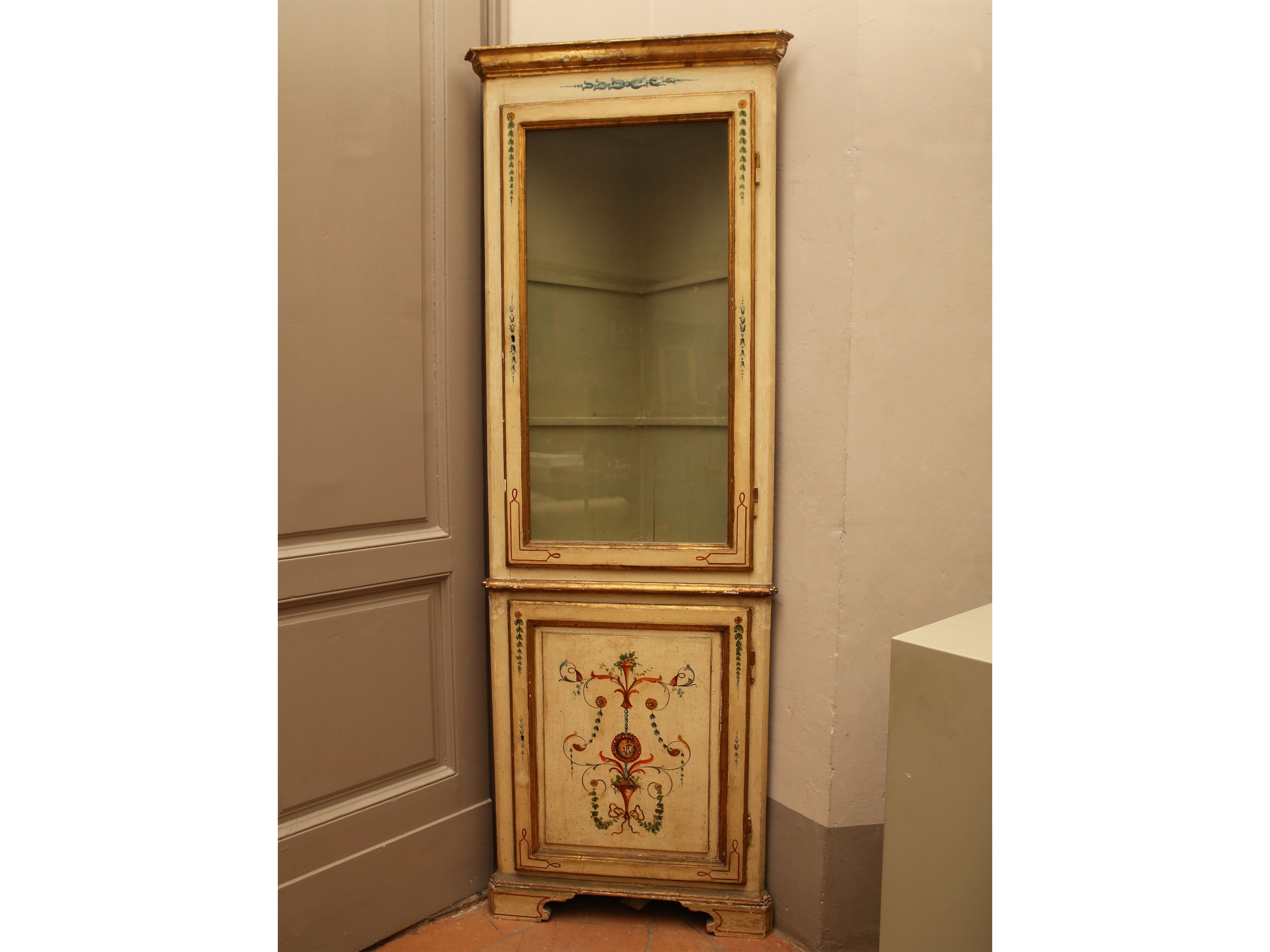 XX secolo uno sportello a vetri nella parte superiore ed uno sottostante dipinto a raffaellesche, piedi a mensola, alcuni difetti