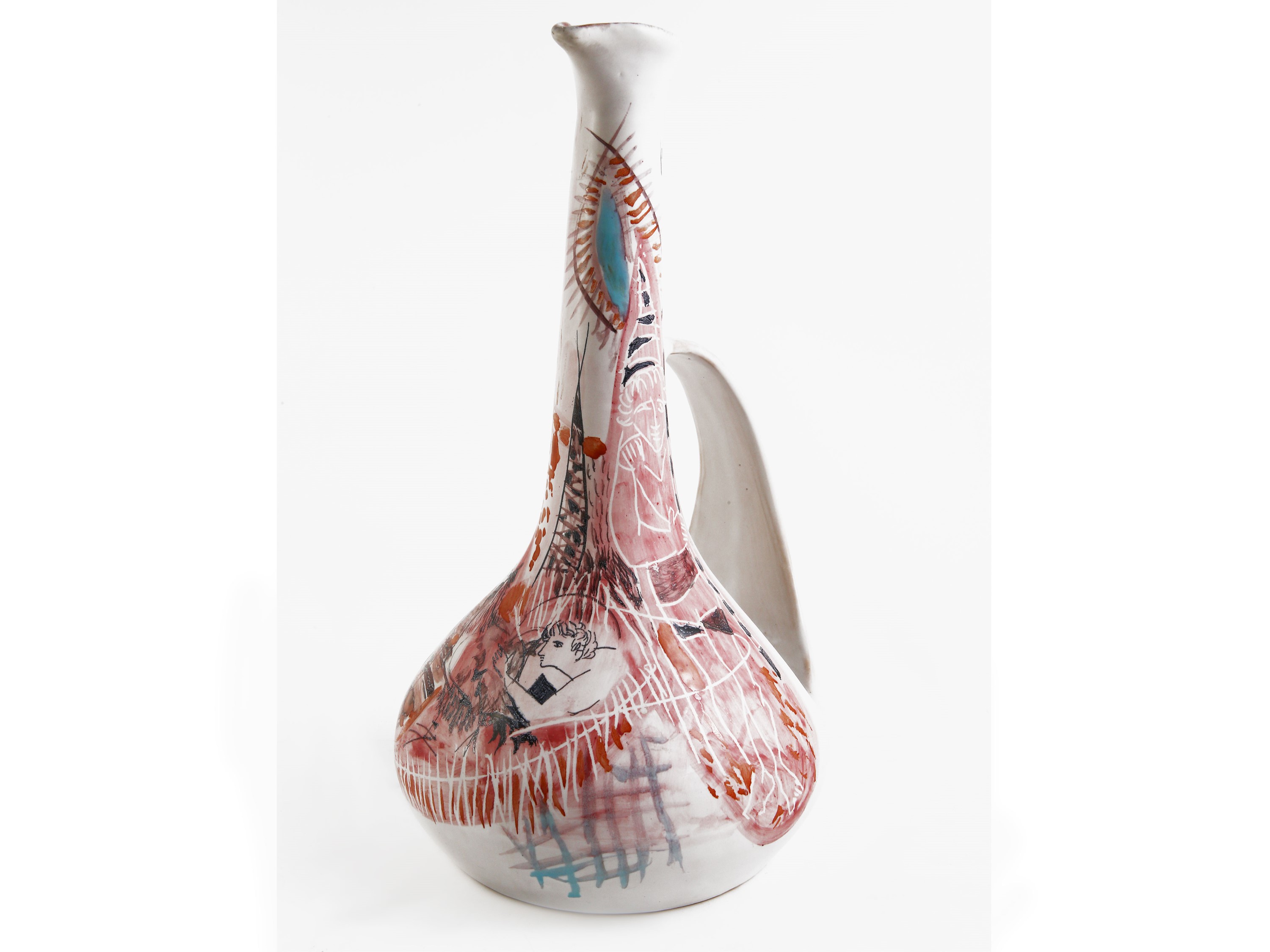 brocca h cm 34, ciotola cm 28x18 dipinti con figure e motivi astratti nei toni del rosa, dell'arancio e dell'azzurro, disegni attribuibili a Nanni Valentini, lievi difetti