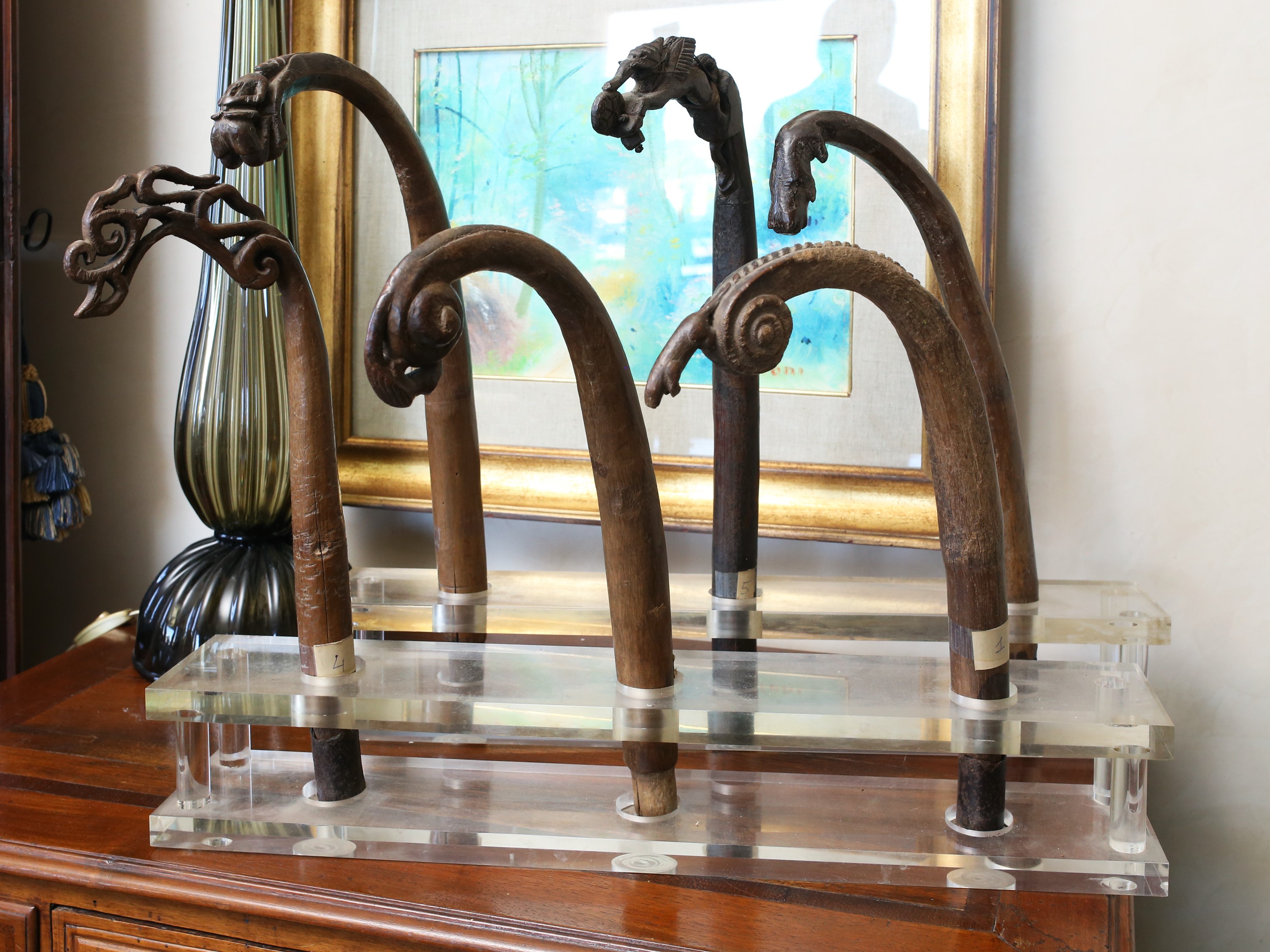 Collezione di sei antichi finali lignei di bastoni cerimoniali