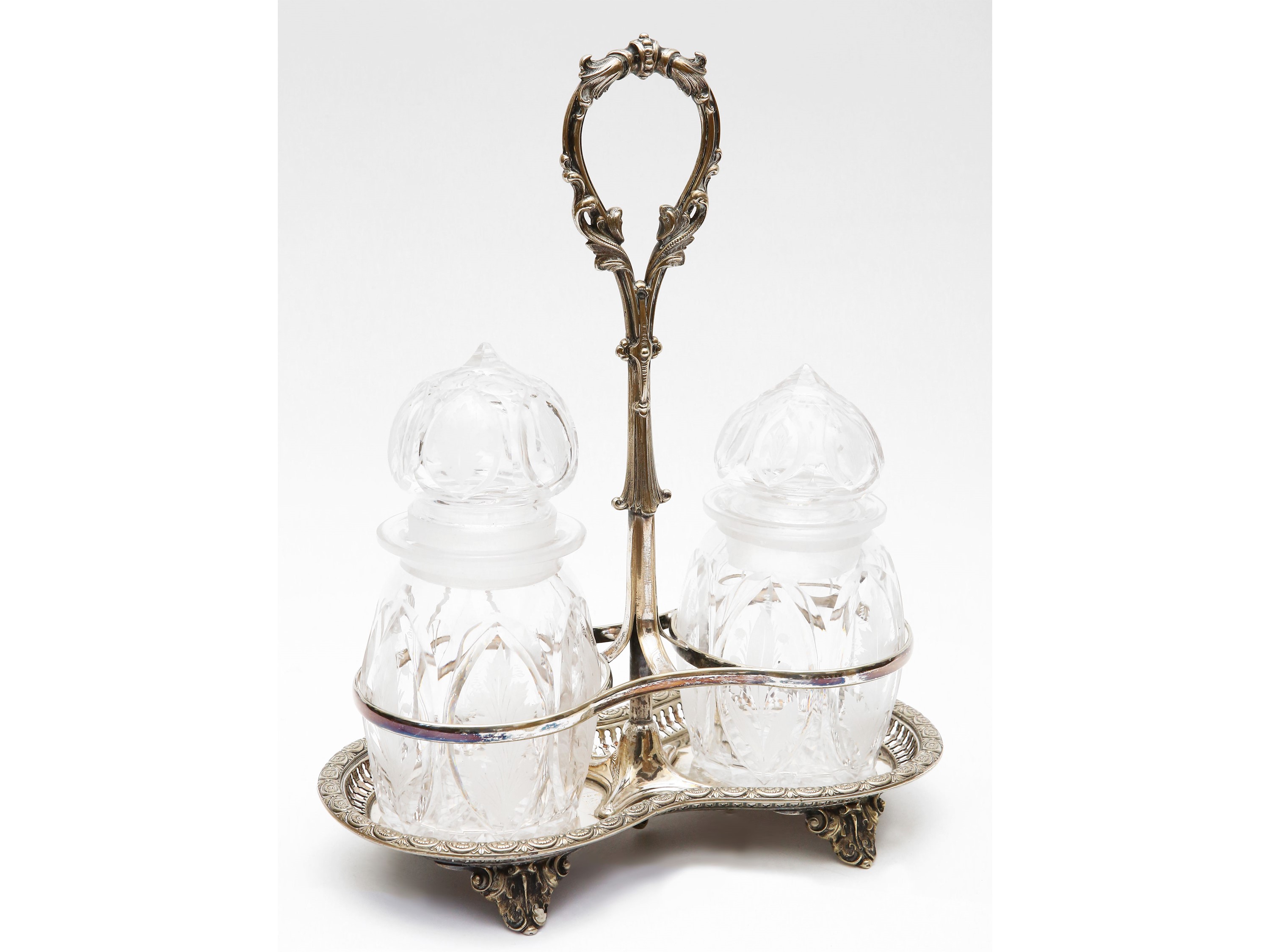 Contenitore per frutta sciroppata o mostarda in metallo argentato e cristallo