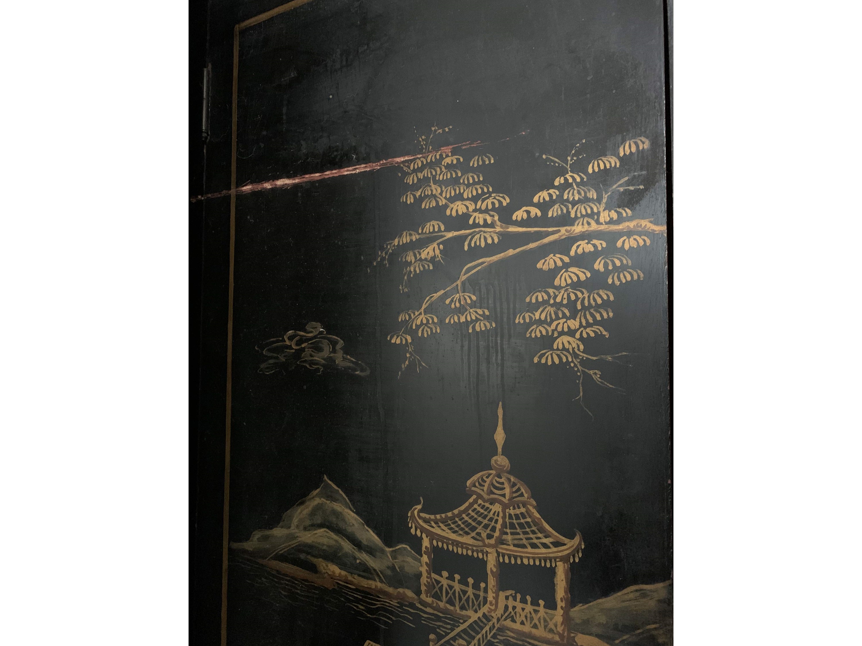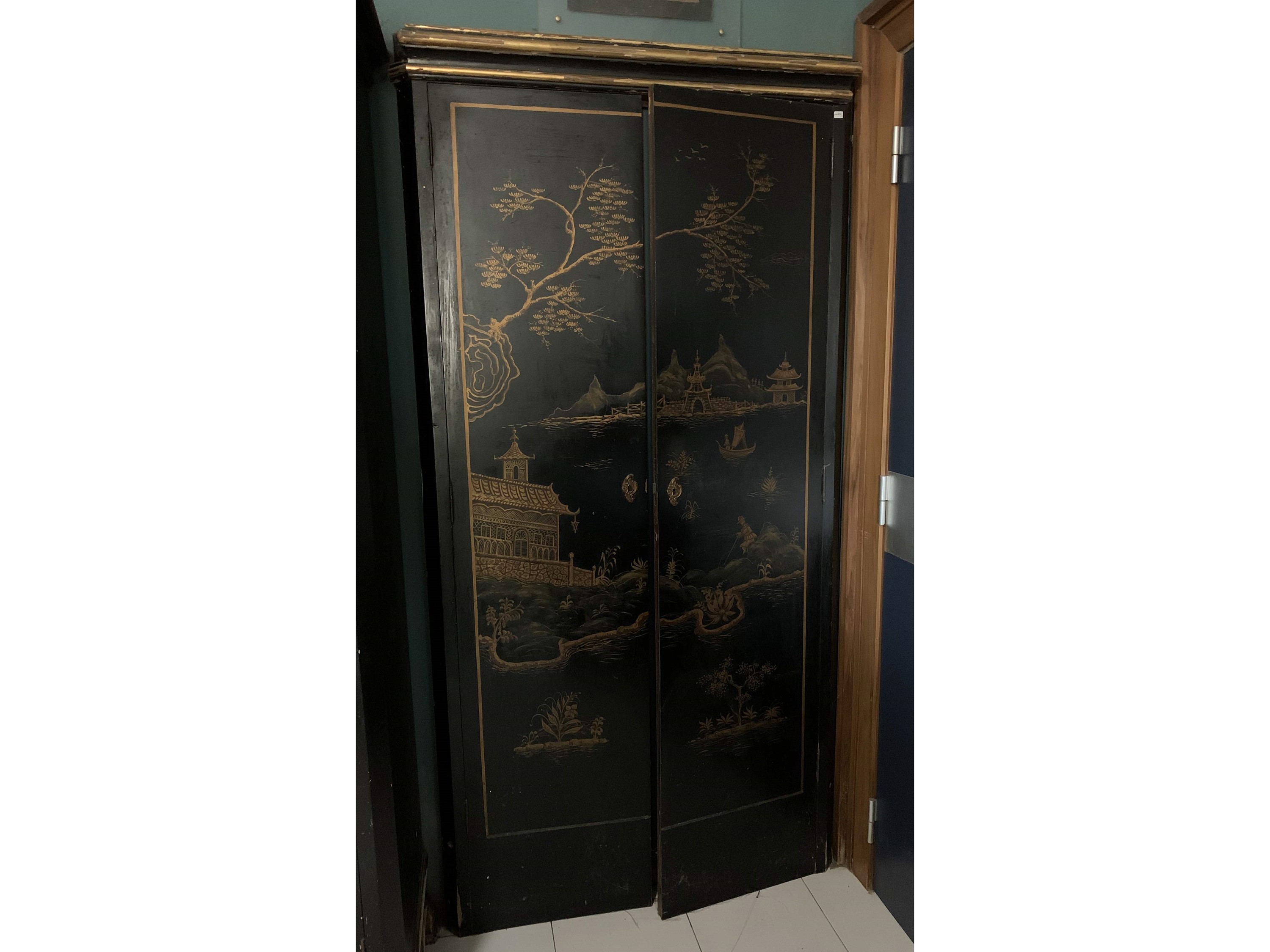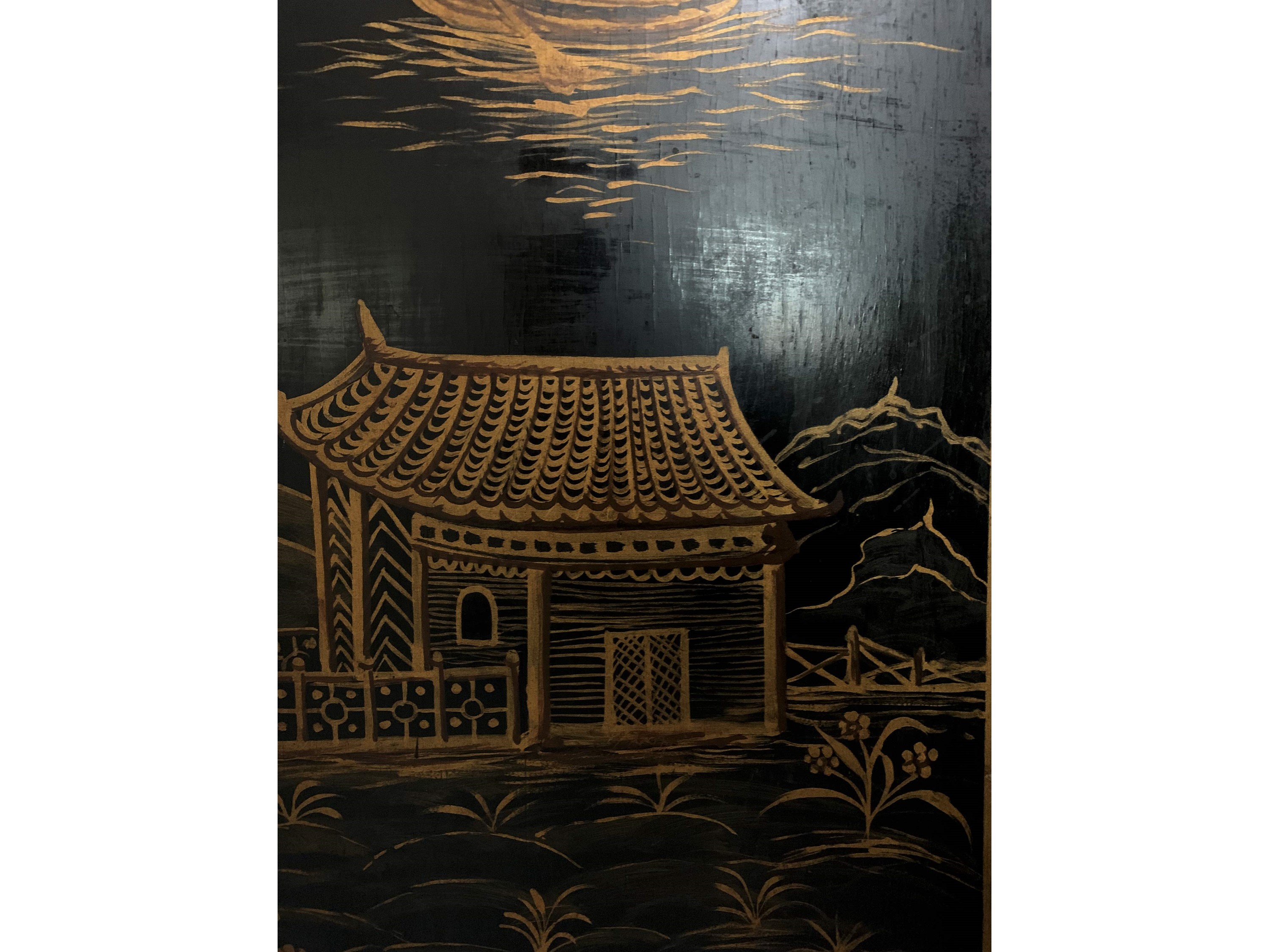 Cina, prima metà del XX secolo ciascuna a due ante decorate con motivo a chinoiserie dorate con paesaggio fluviale e pagode, alcuni difetti