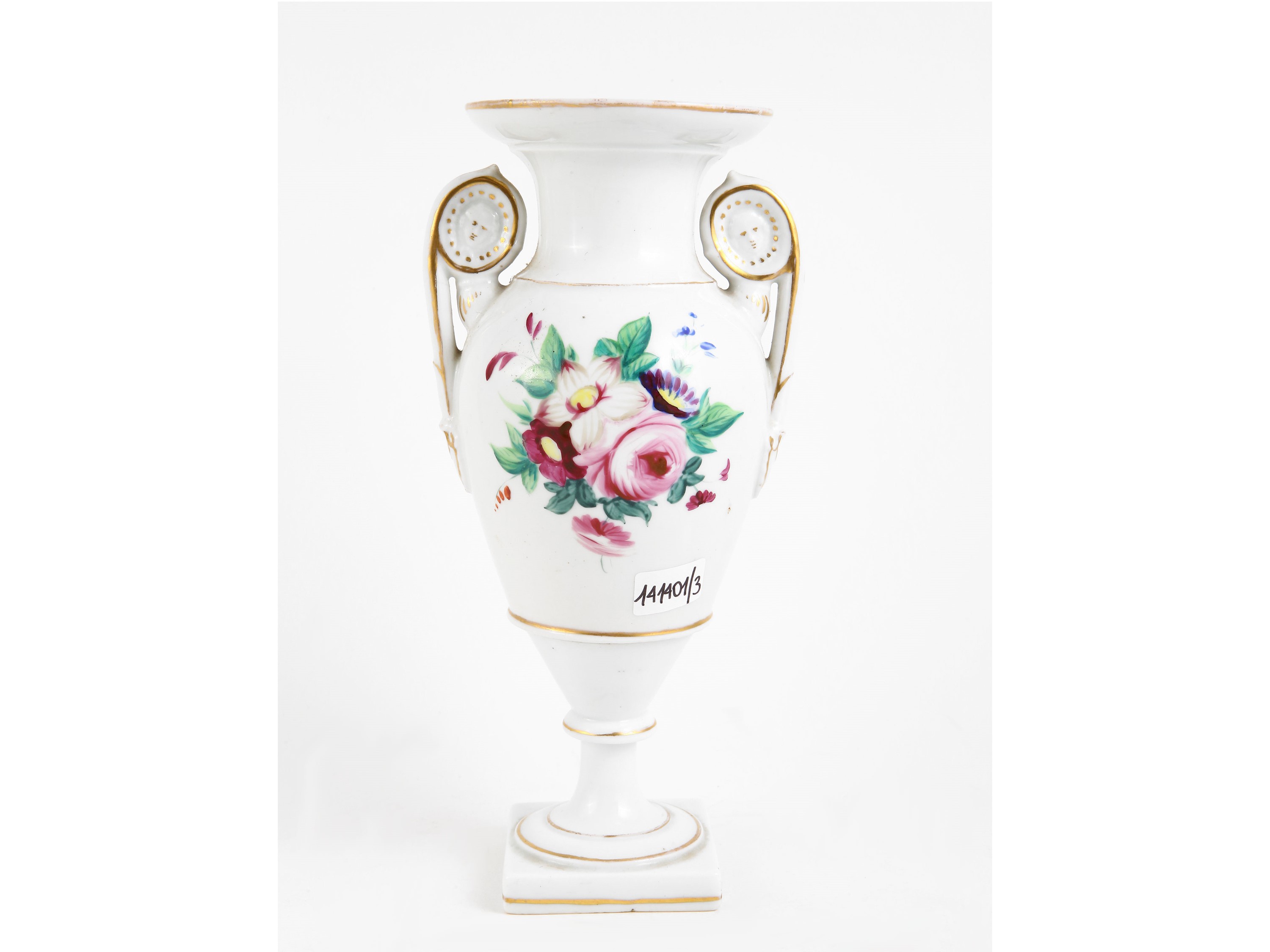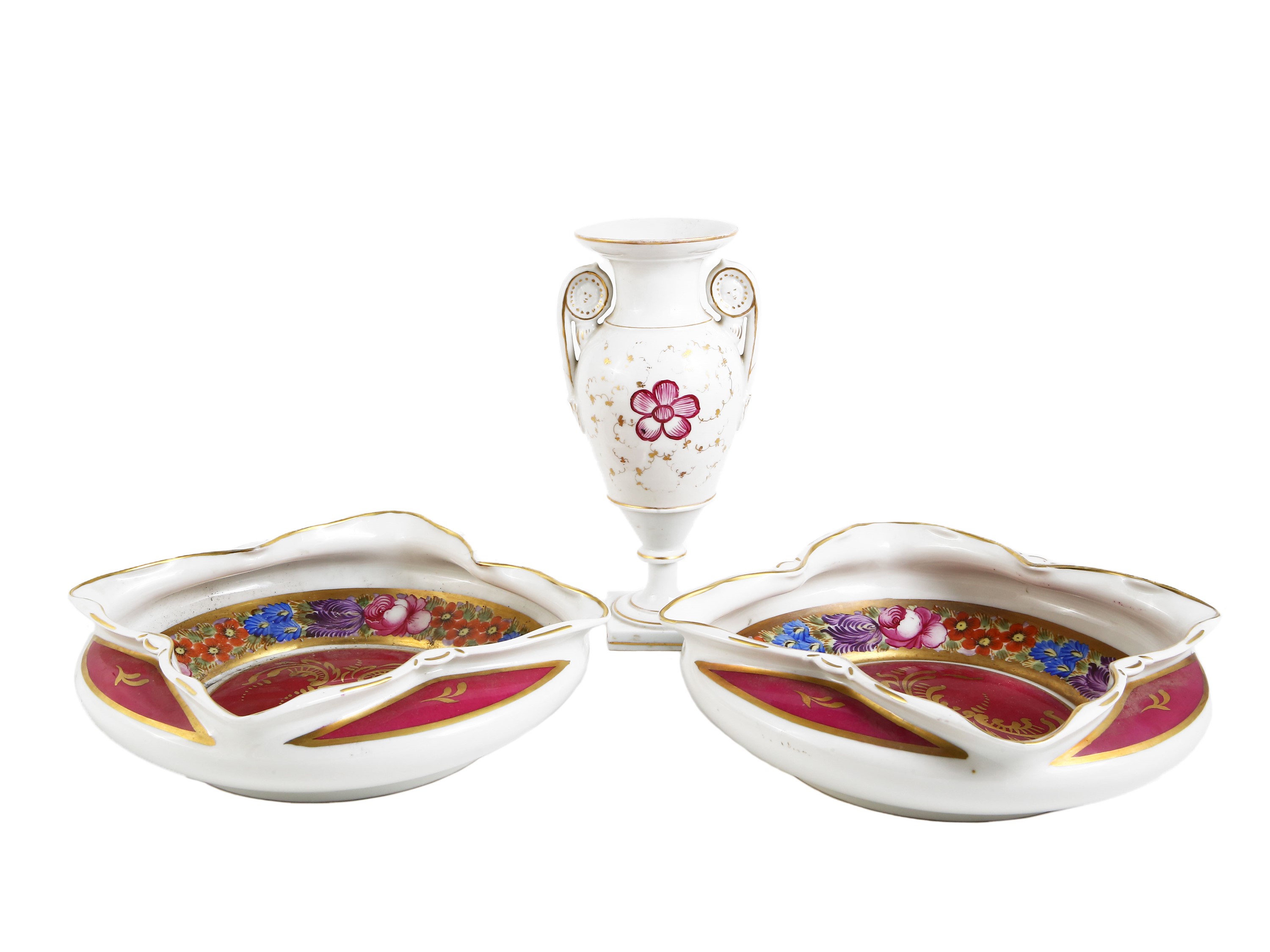 centrotavola cm 24x24, vaso h cm 22,5 Francia, metà del XIX secolo composto da due centrotavola, corpo a cipolla schiacciata con collo a quattro punte, dipinti a motivi floreali su fondo porpora con lumeggiature in oro e un vaso di gusto Impero dipinto a motivi floreali, lievi difetti